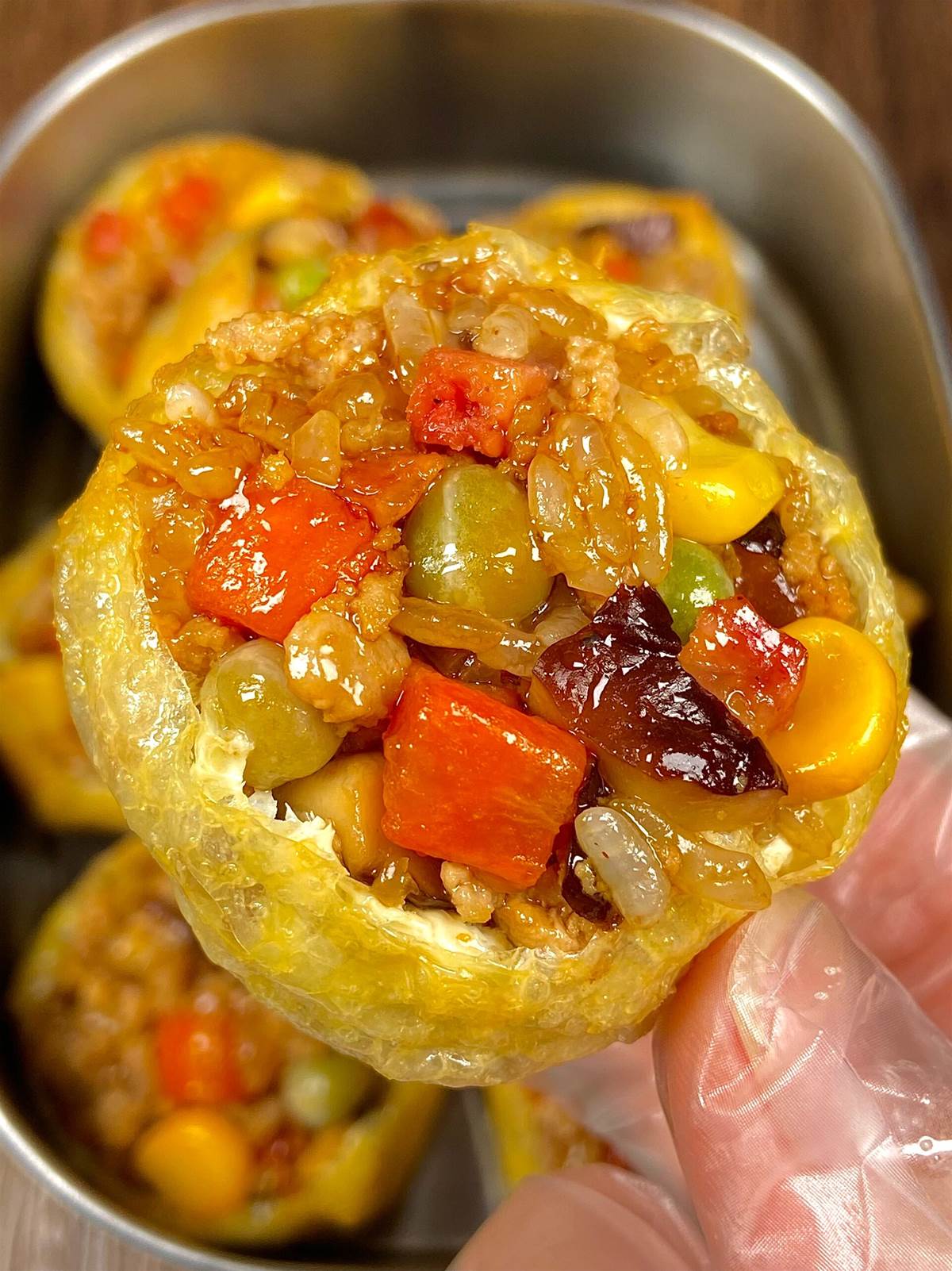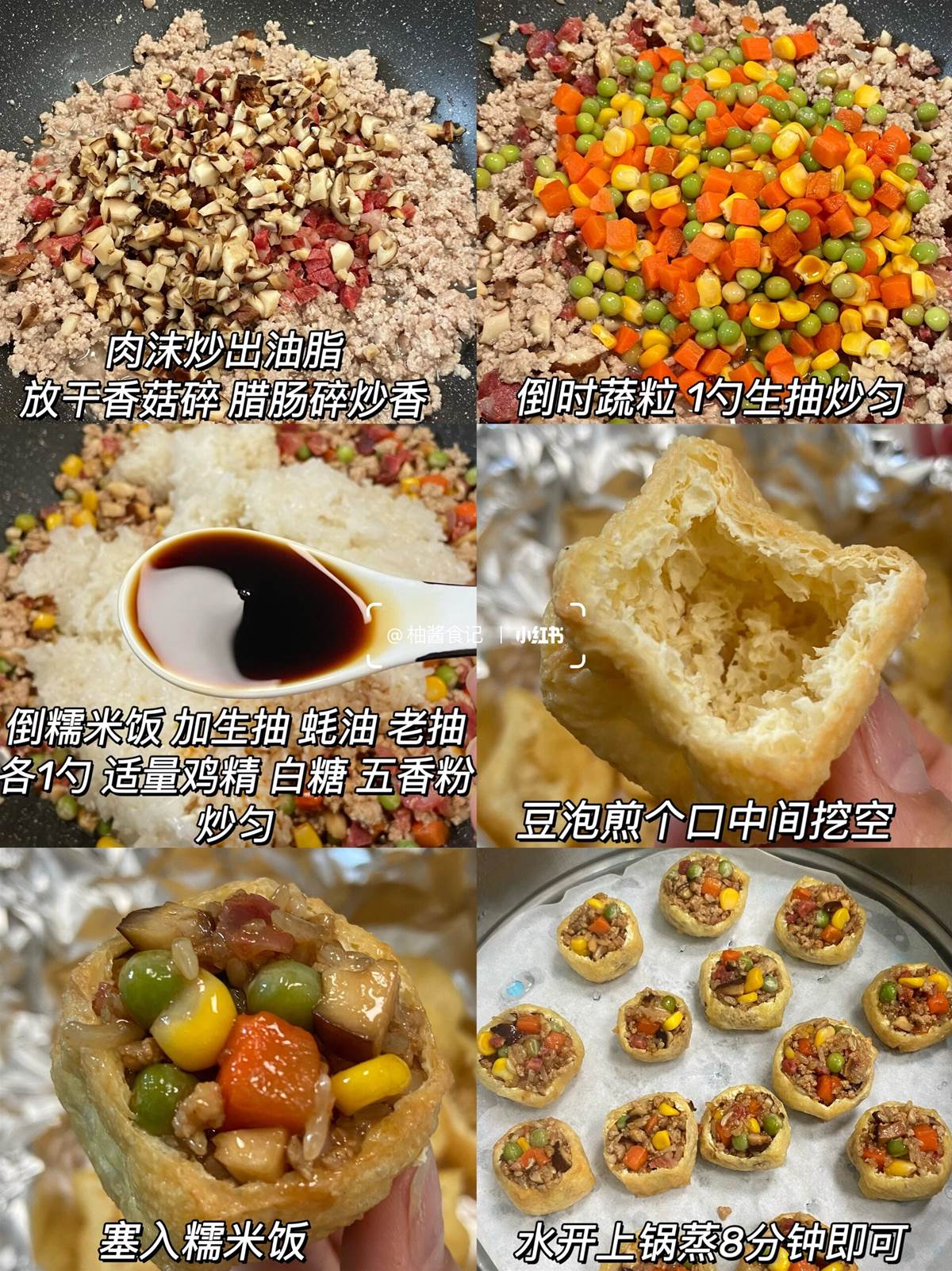 3、倒時蔬粒,加1勺生抽炒勻4、倒糯米飯,加生抽、老抽、蠔油各1勺、適量雞精、白糖、五香粉炒勻5、豆泡塞入糯米飯,水開上鍋蒸8分鐘即可!!