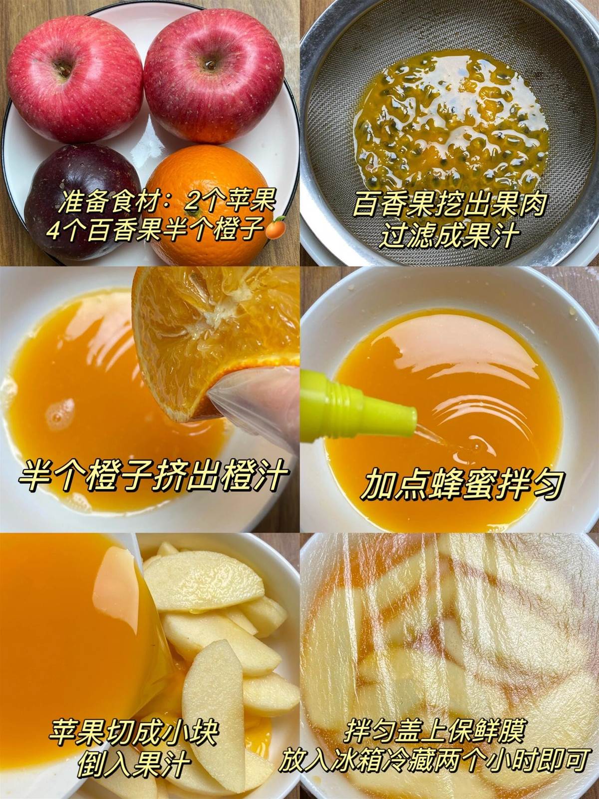 處理蘋果:蘋果去皮(也可以不去,看個人喜好),切成厚片或小塊。準備料汁:找一個乾淨的密封罐,放入百香果肉、去籽的檸檬片、冰糖。注入靈魂:倒入雪碧,雪碧的量要剛好沒過蘋果。如果雪碧不夠,可以加一點點涼白開。冷藏:蓋上蓋子,放入冰箱冷藏醃製 2 小時以上。開吃:拿出來的時候蘋果已經吸飽了湯汁,變得晶瑩剔透,冰冰涼涼直接開炫!