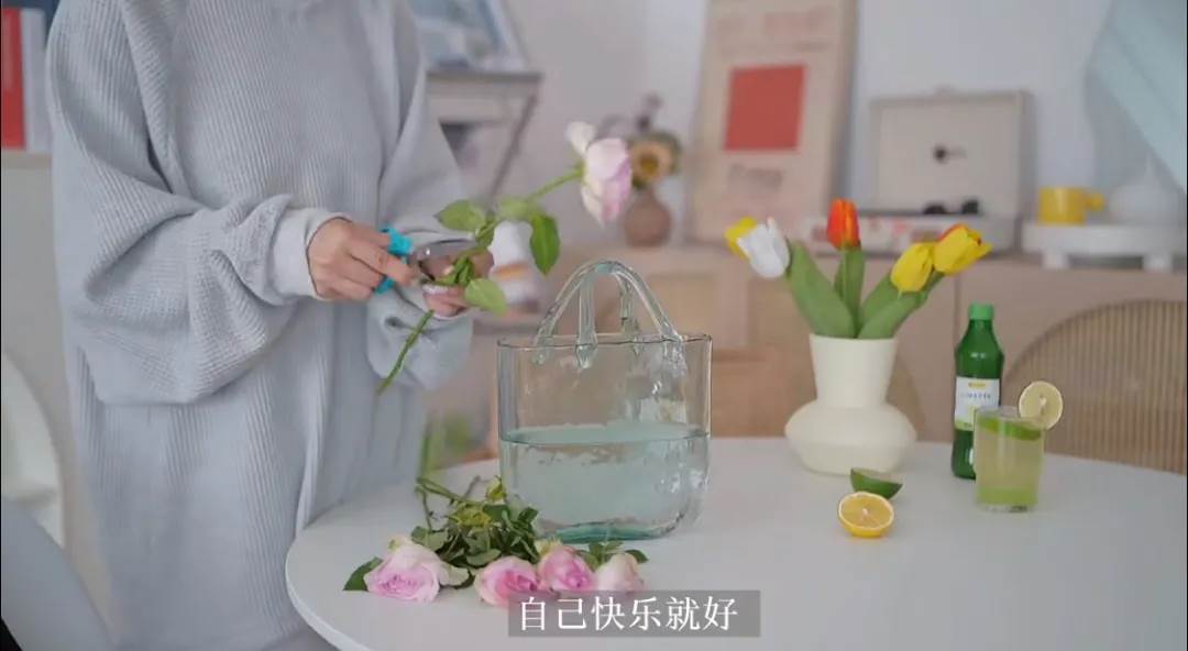 她把新買的玻璃花瓶放到餐桌上,拿起剪刀,慢悠悠地修剪著花枝。