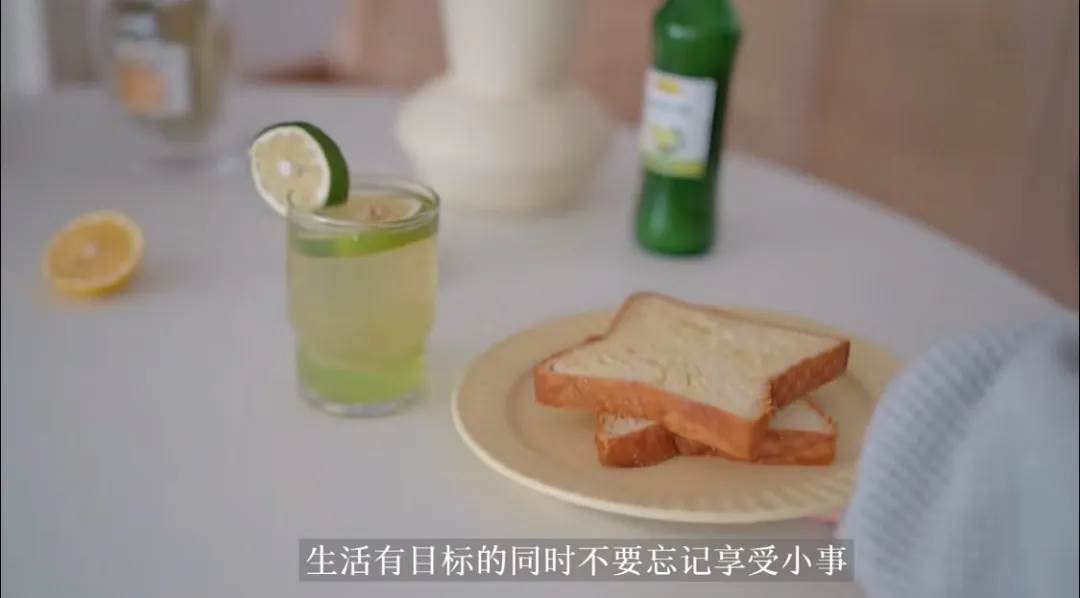 接著,在玻璃杯裡倒上檸檬水,然後在嫩黃色的盤子裡擺上兩片麵包,用充滿儀式感的早飯,開啟元氣滿滿的一天。