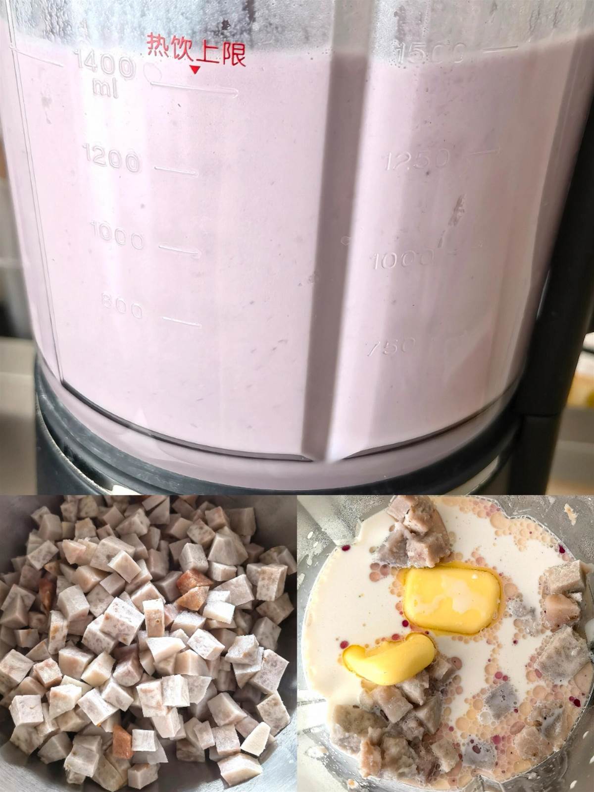 1.戴手套將芋頭去皮切小丁,上鍋蒸30分鐘左右,至芋頭可以輕鬆壓爛的程度,趁熱倒入破壁機,並且加入其他所有食材,破壁機高速攪打三分鐘左右,就很細膩了;