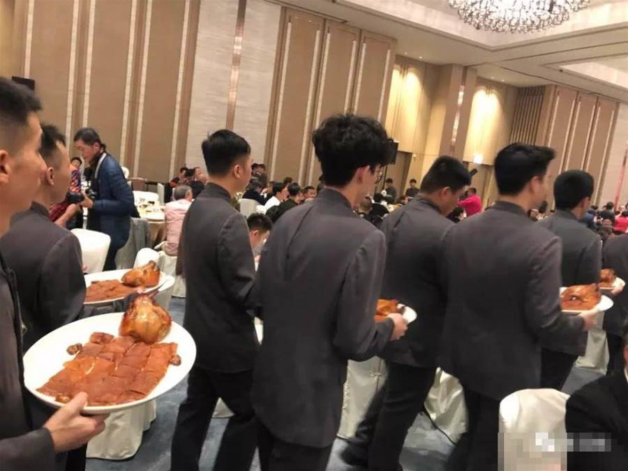 「賭船之父」葉壽75歲壽宴上,服務員列隊上菜烤乳豬。