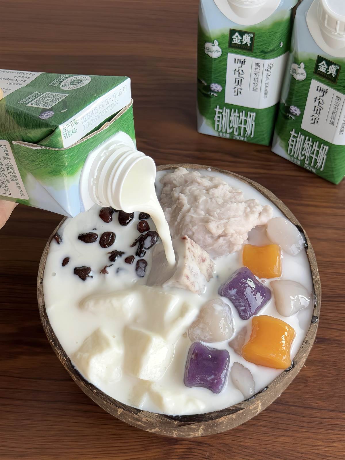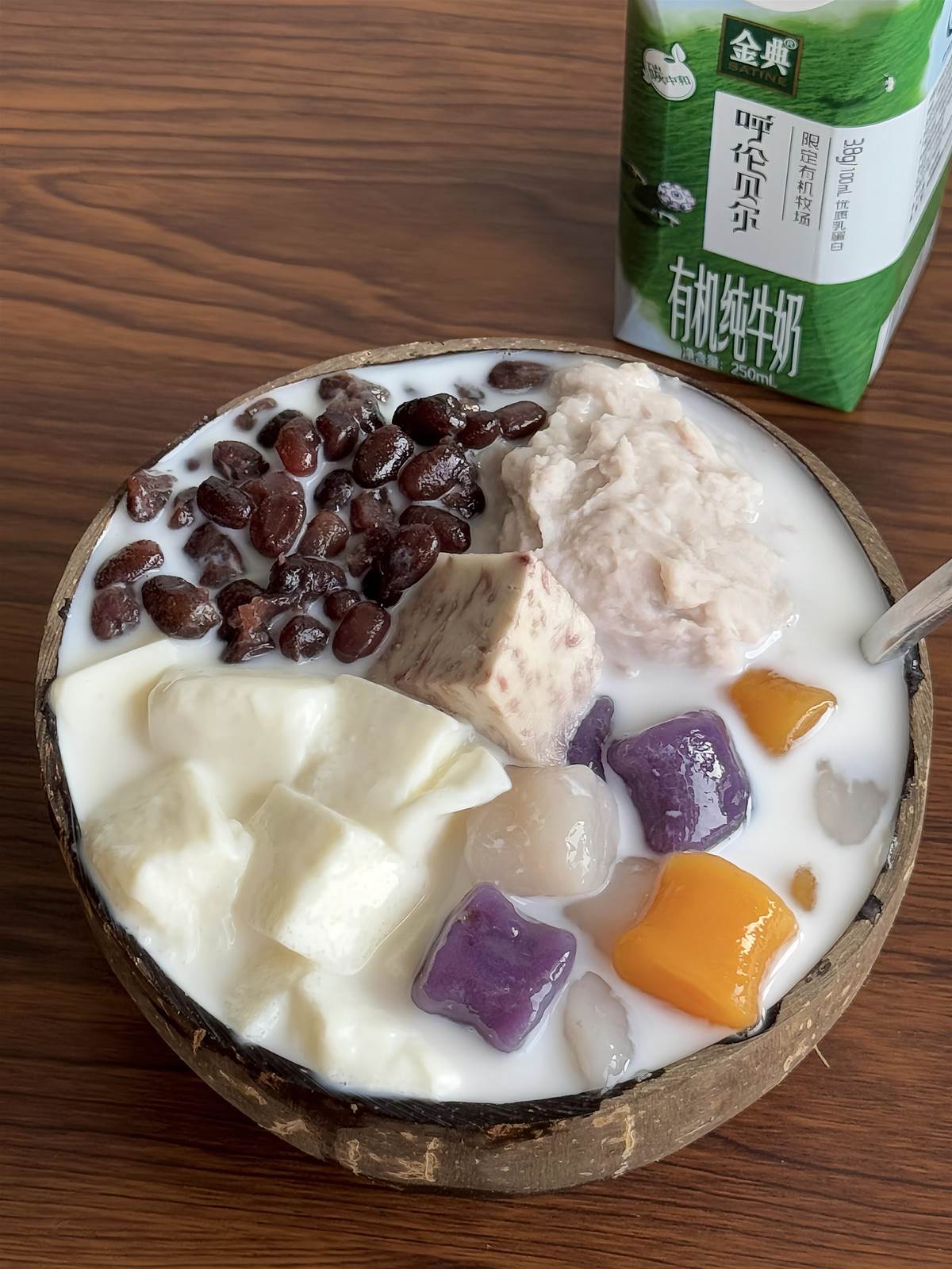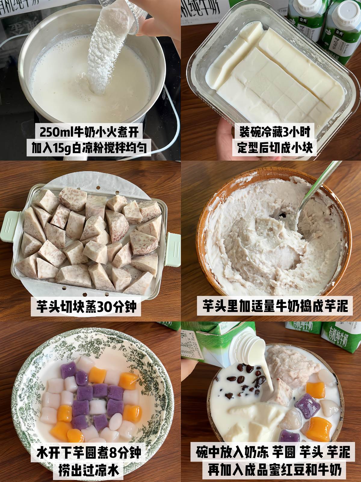 4️⃣ 最後就是快樂組裝:碗裡放入奶凍、芋圓、芋頭塊、芋泥,鋪上糖納紅小豆,再倒滿牛奶就完成啦!