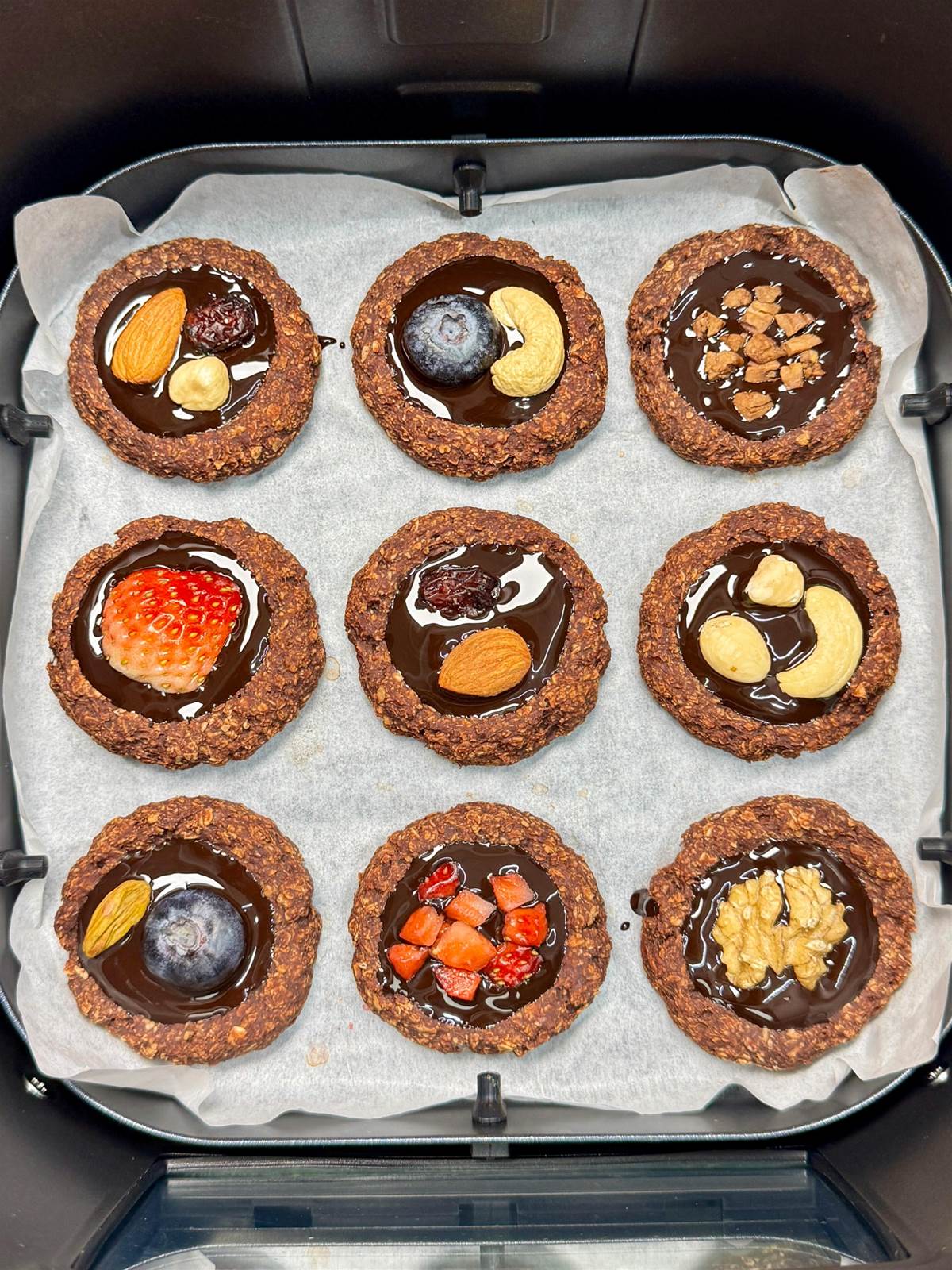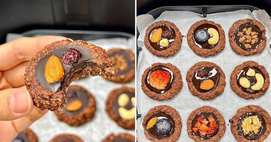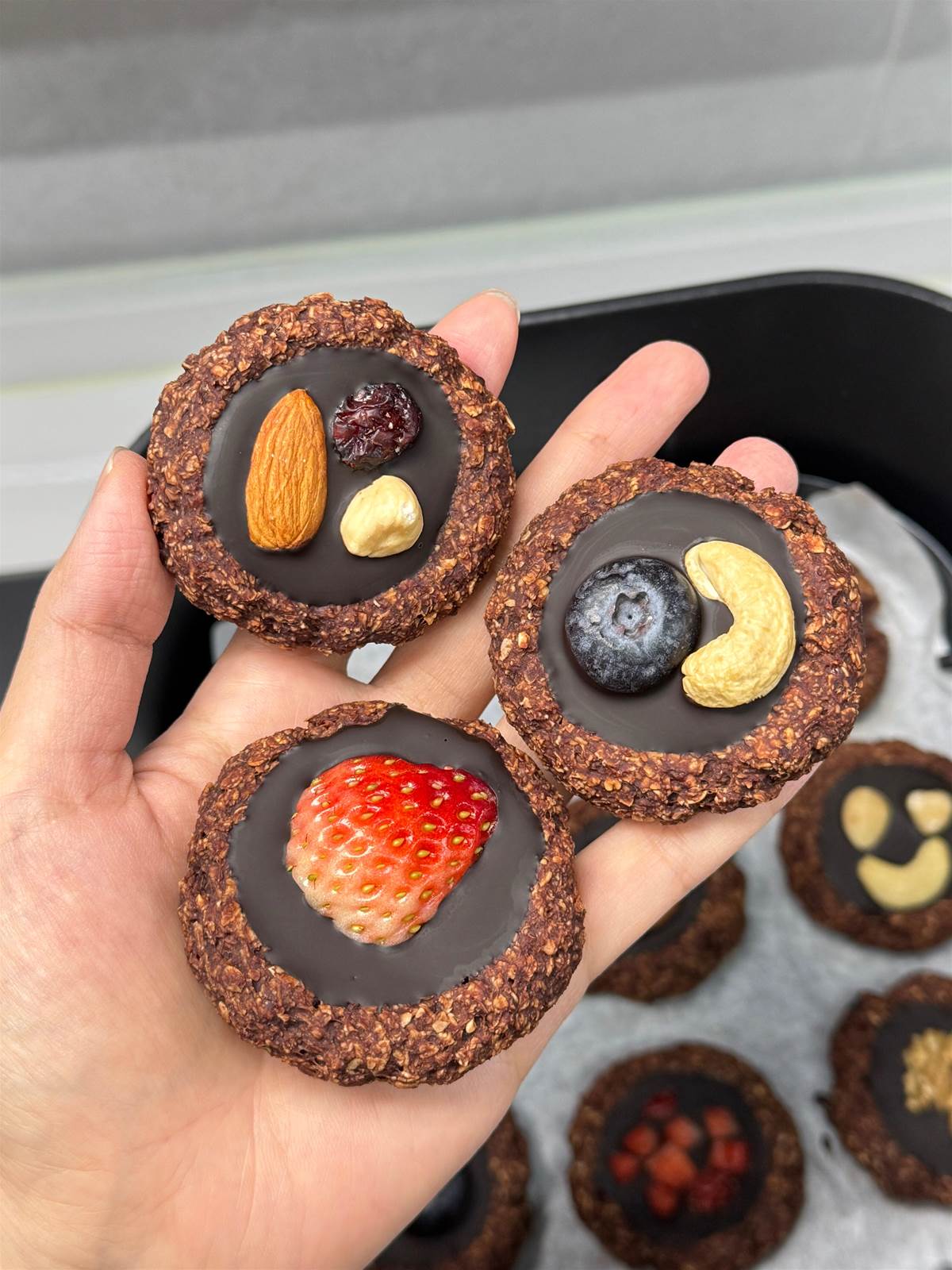 3做法簡單到離譜,新手閉眼衝!先把兩根熟透的香蕉壓成泥,加一碗即食燕麥片、一勺可可粉,攪拌均勻後,捏成一個個小圓團,放進模具裡壓出小碗的形狀,撻皮就做好了。接著在撻皮裡塞滿黑巧克力碎,再鋪上一層藍莓、草莓,撒上杏仁、腰果、核桃碎,最後放進空氣炸鍋,180度烤8分鐘,香味直接飄滿整個屋子!