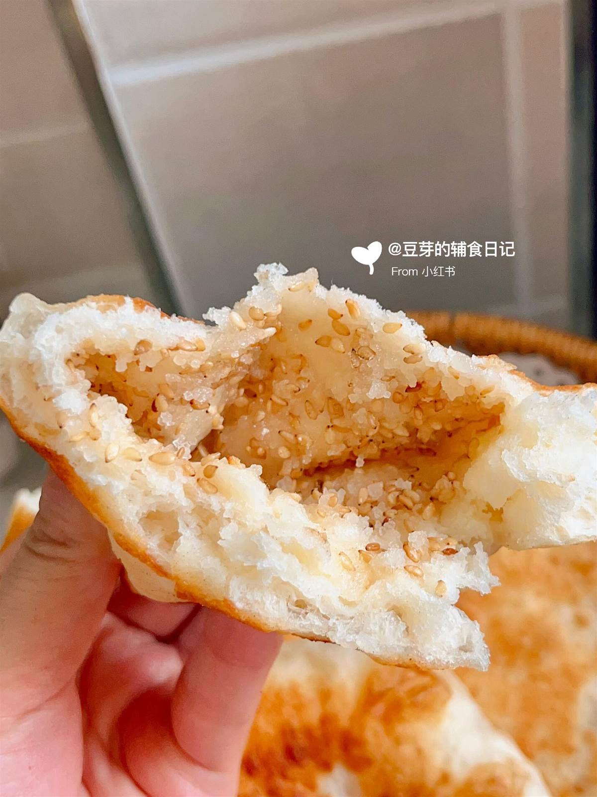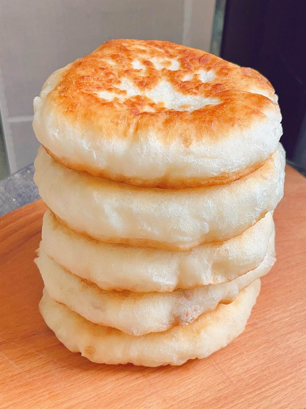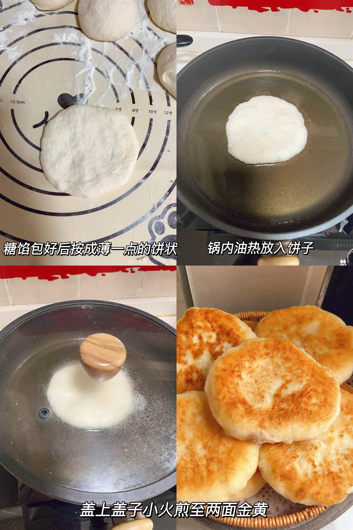 4⃣️包好後放在案板上按成薄一點的餅狀,鍋內油熱放入餅子,蓋上蓋子小火烙至兩面金黃
