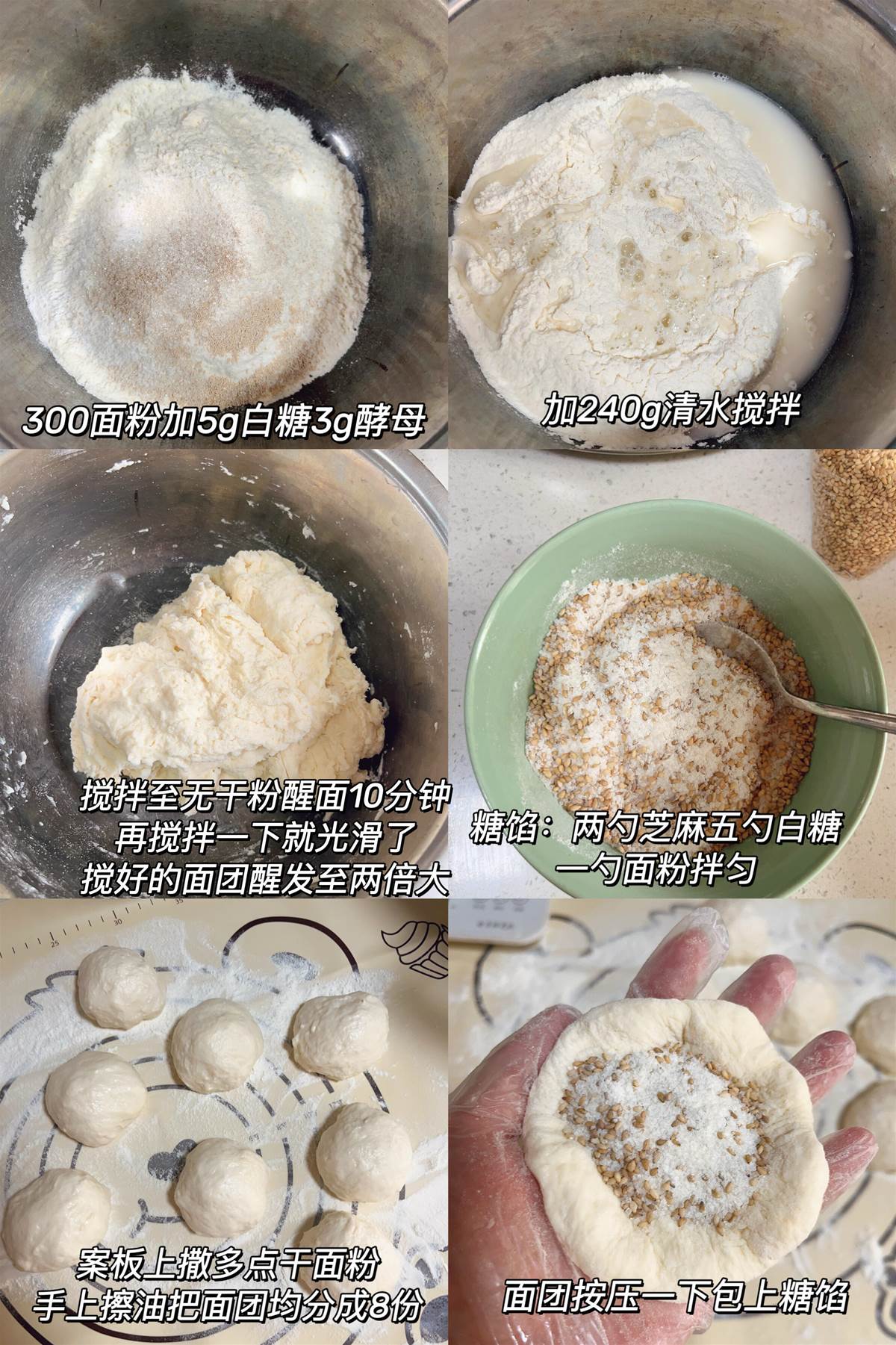 食材 300g麵粉、3g酵母、5g白糖、250g清水 糖餡:芝麻、白糖、麵粉