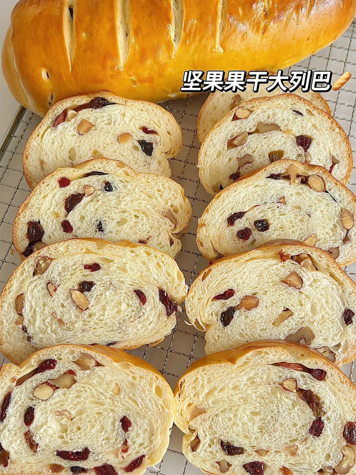 今天做了果乾列巴,加了超多堅果果乾,真的很喜歡這種紮實口感有嚼勁的麵包~