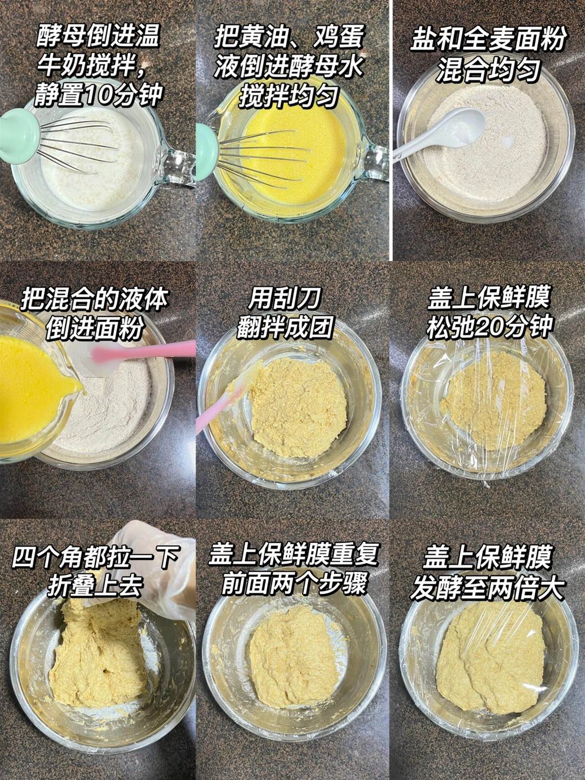260克全麥麵包粉、180克純牛奶、20克黃油、20克細砂糖、1個雞蛋、3克耐高糖酵母、2克鹽