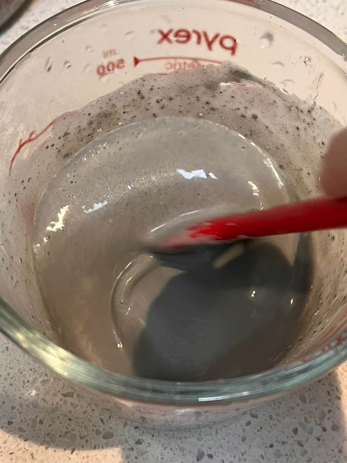 4.把混合好的牛奶液倒入之前備好的黑芝麻乳酪糊裡,攪拌均勻
