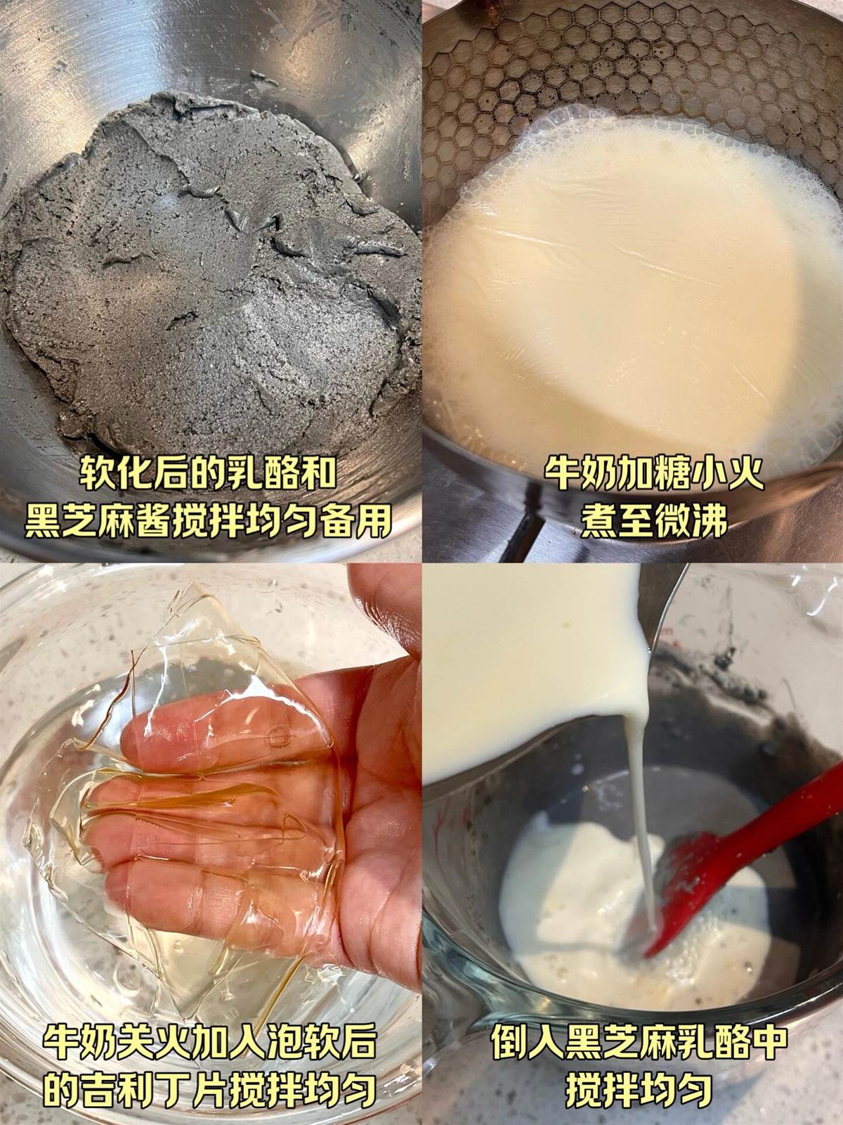 準備材料: 奶油乳酪50g 黑芝麻醬30g 吉利丁片5g 牛奶250g 白糖20g
