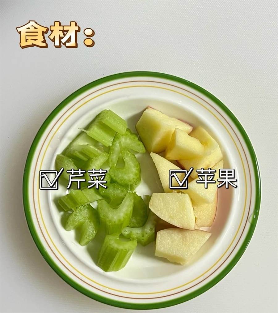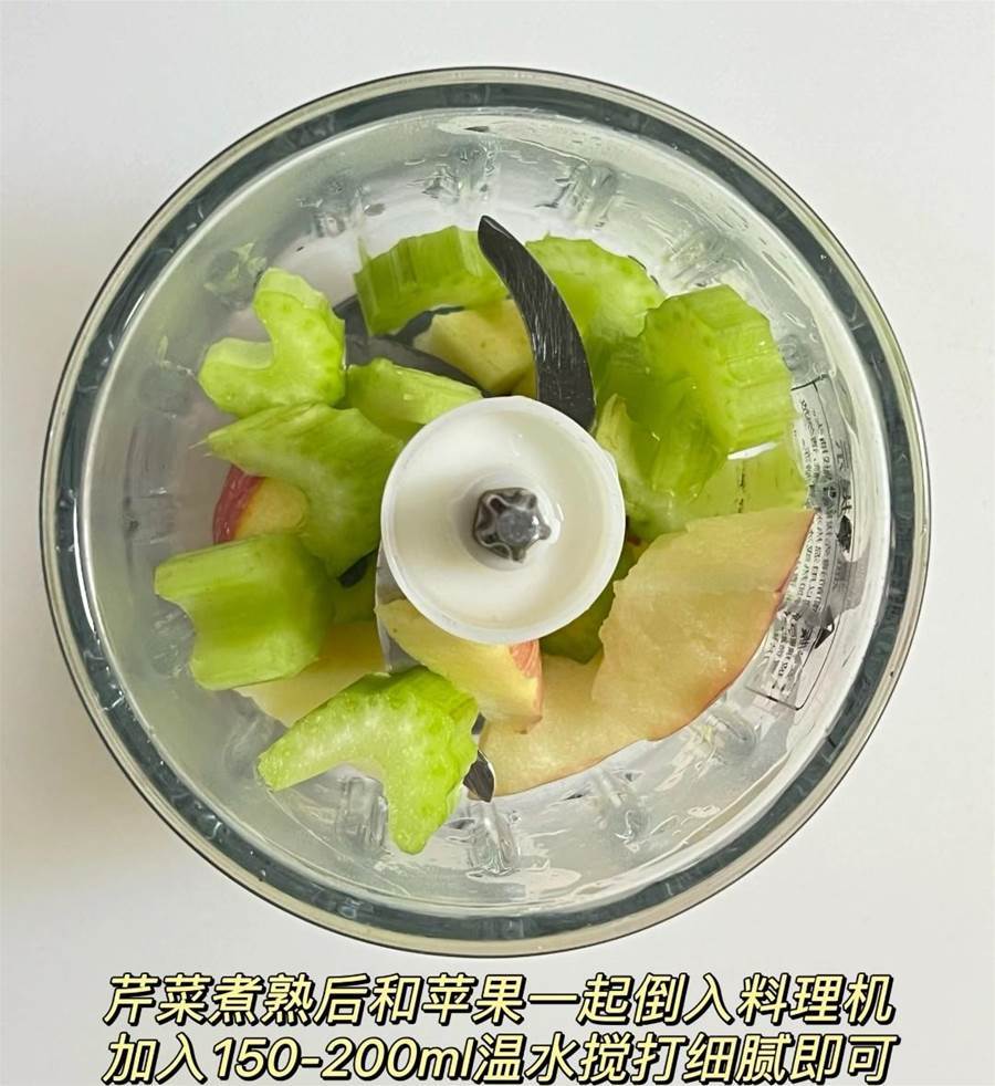 將芹菜洗凈后煮熟,蘋果洗凈去皮去核,切成塊。