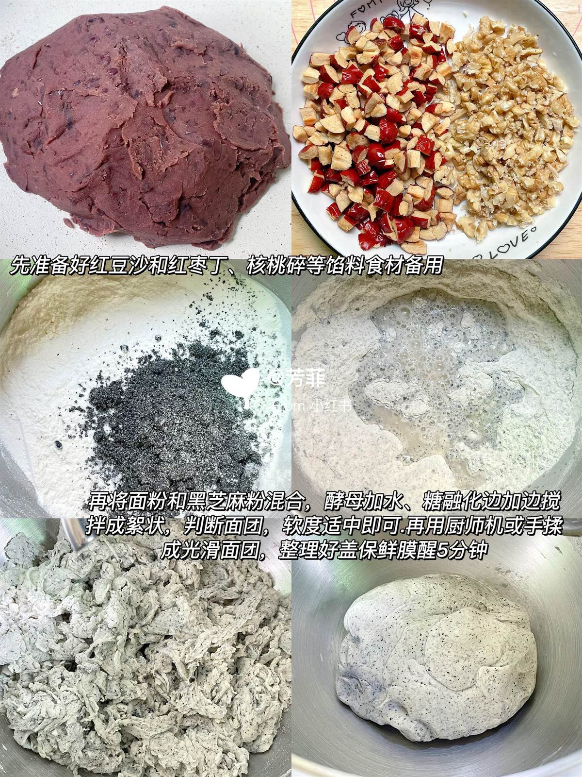 食材:中筋麵粉350克 、熟黑芝麻粉25~30克、 酵母3克、 細砂糖10~20克(可不加)、清水155克(按麵粉吸水性靈活調節)、紅豆餡約350克 、紅棗/核桃碎適量