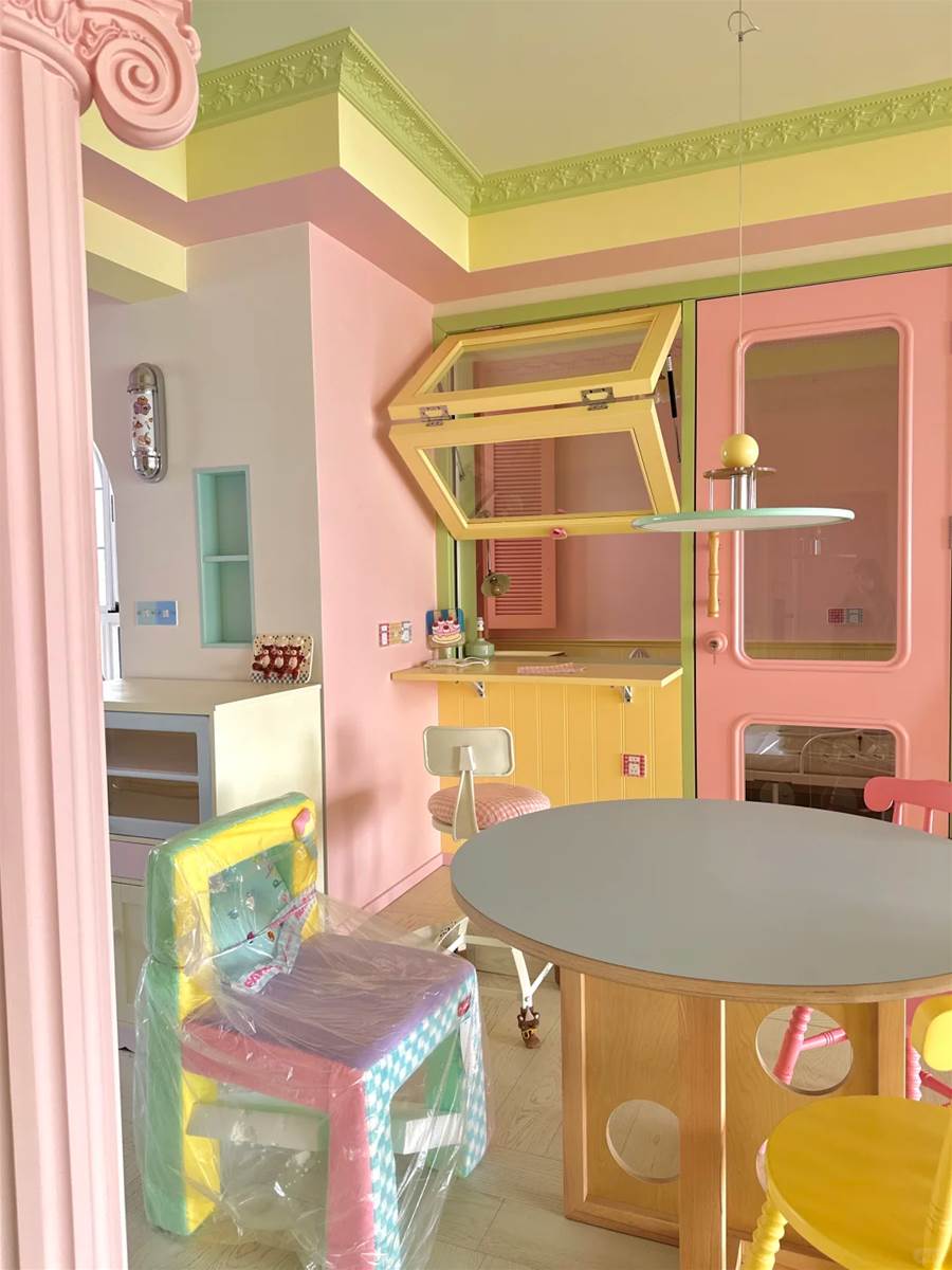 這個家的裝修,從一開始就拒絕了千篇一律的黑白灰,而是大膽采用了多巴胺色彩搭配,把童話里的繽紛世界搬進了現實。墻面以柔和的粉色為主調,搭配清新的薄荷綠與明亮的鵝黃色,再用復古的石膏線勾勒出精致的線條,讓空間既有少女心的浪漫,又不失歐式復古的優雅。每一種顏色都經過反復調試,確保明度與飽和度恰到好處,既不會過于刺眼,又能在陽光下煥發出鮮活的生命力。