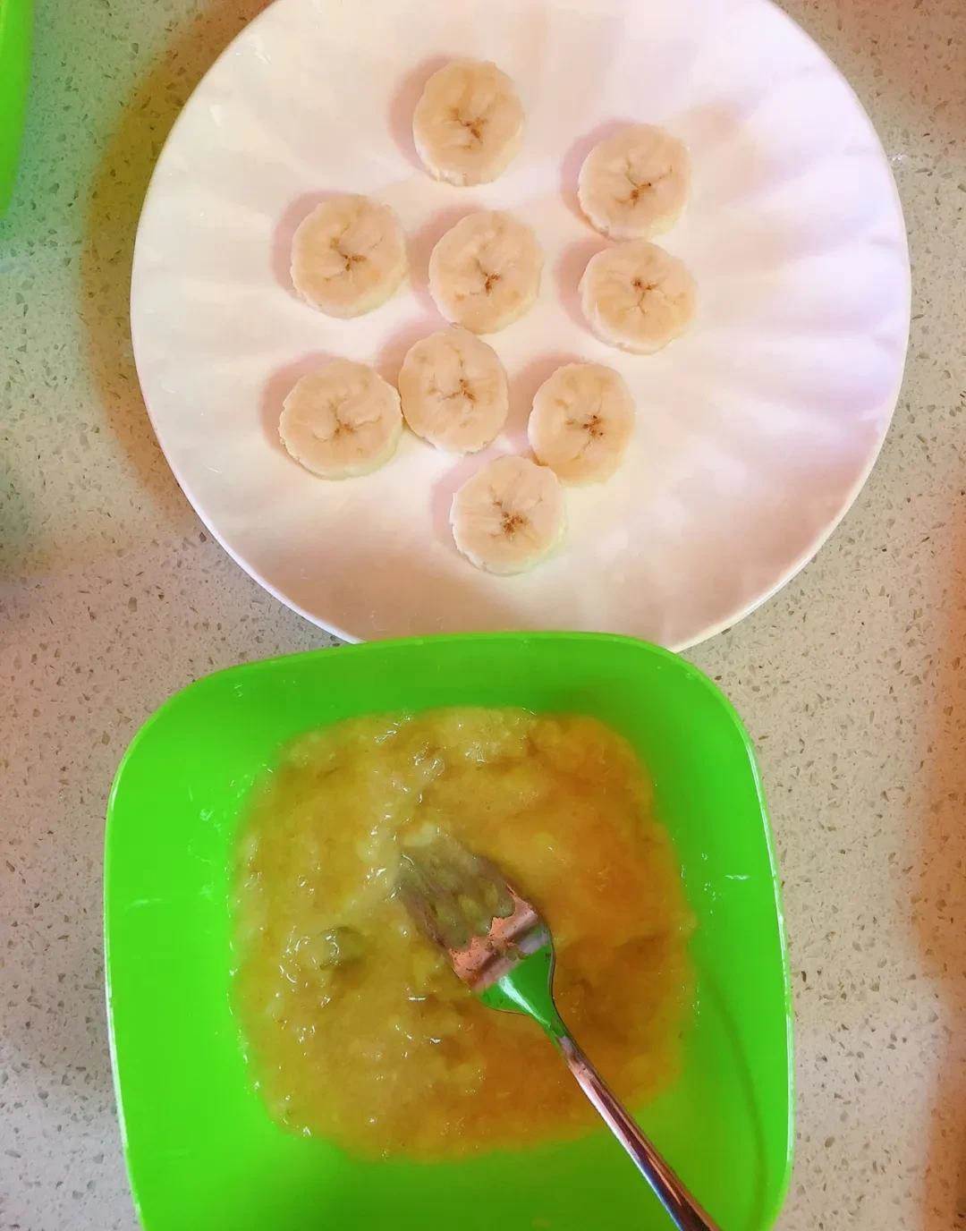 2 / 先處理香蕉,香蕉切幾片留著後面裝飾用,其它的壓成泥備用。