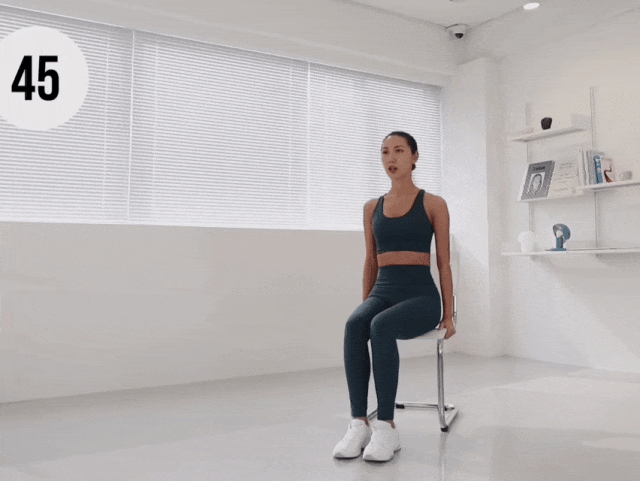 坐立,雙手握住椅子兩側 脊柱立直,腹部核心收緊 呼氣,抬右腿向上 吸氣,還原,交換另一側 左右交替為一組,重復練習45秒