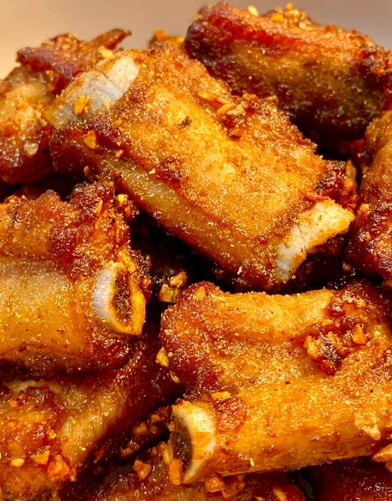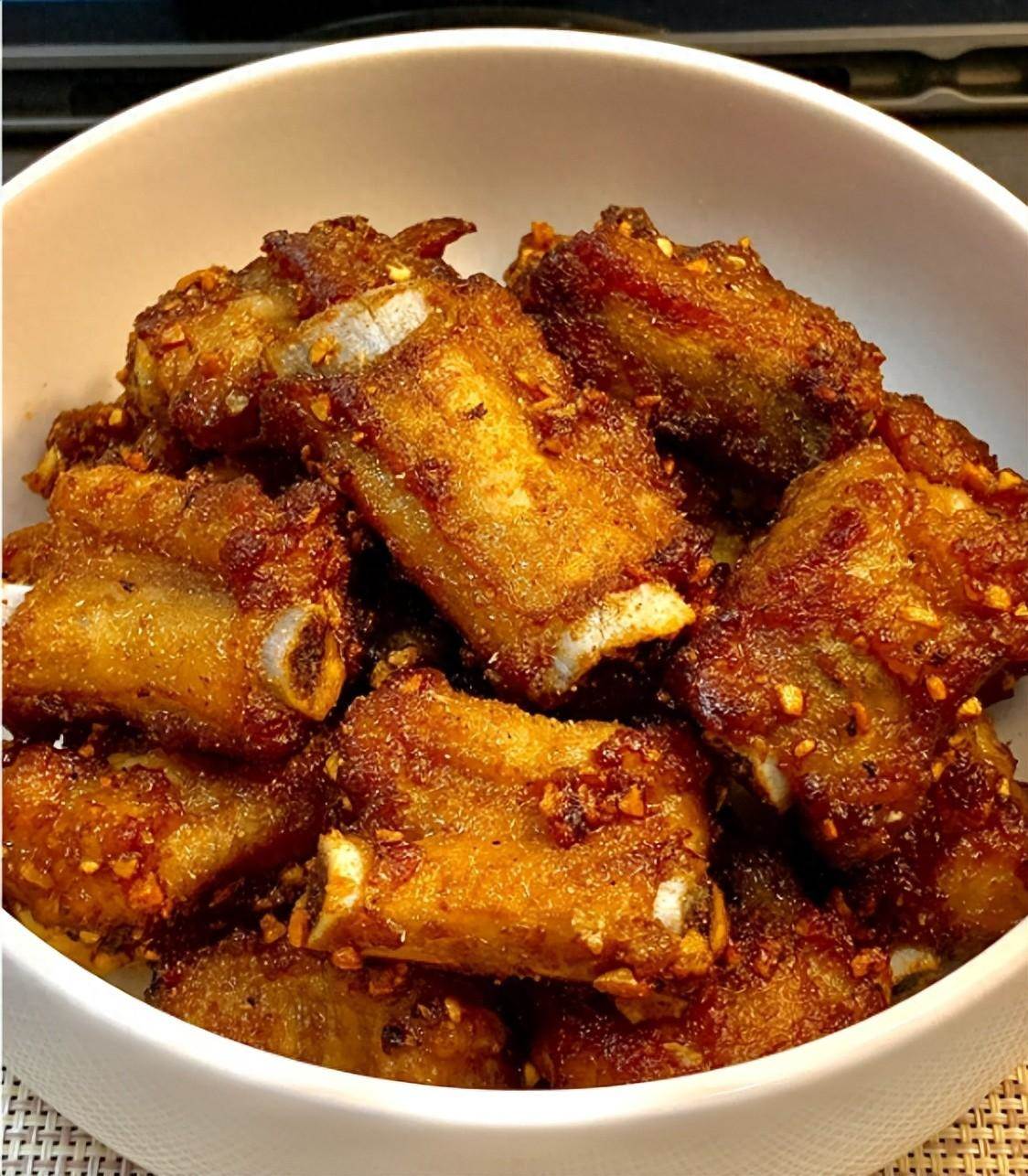 這道椒鹽蒜香排骨外酥里嫩,蒜香味十足,撒上椒鹽粉好吃到吮手指,一斤根本不夠吃。