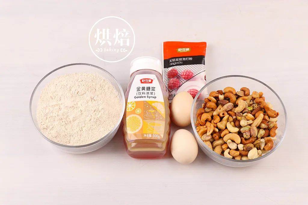雞蛋 2個/舒可曼金黃轉化糖漿100g/全麥粉250g/泡打粉 4g/堅果仁250g