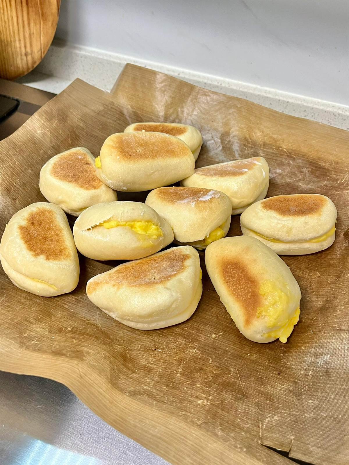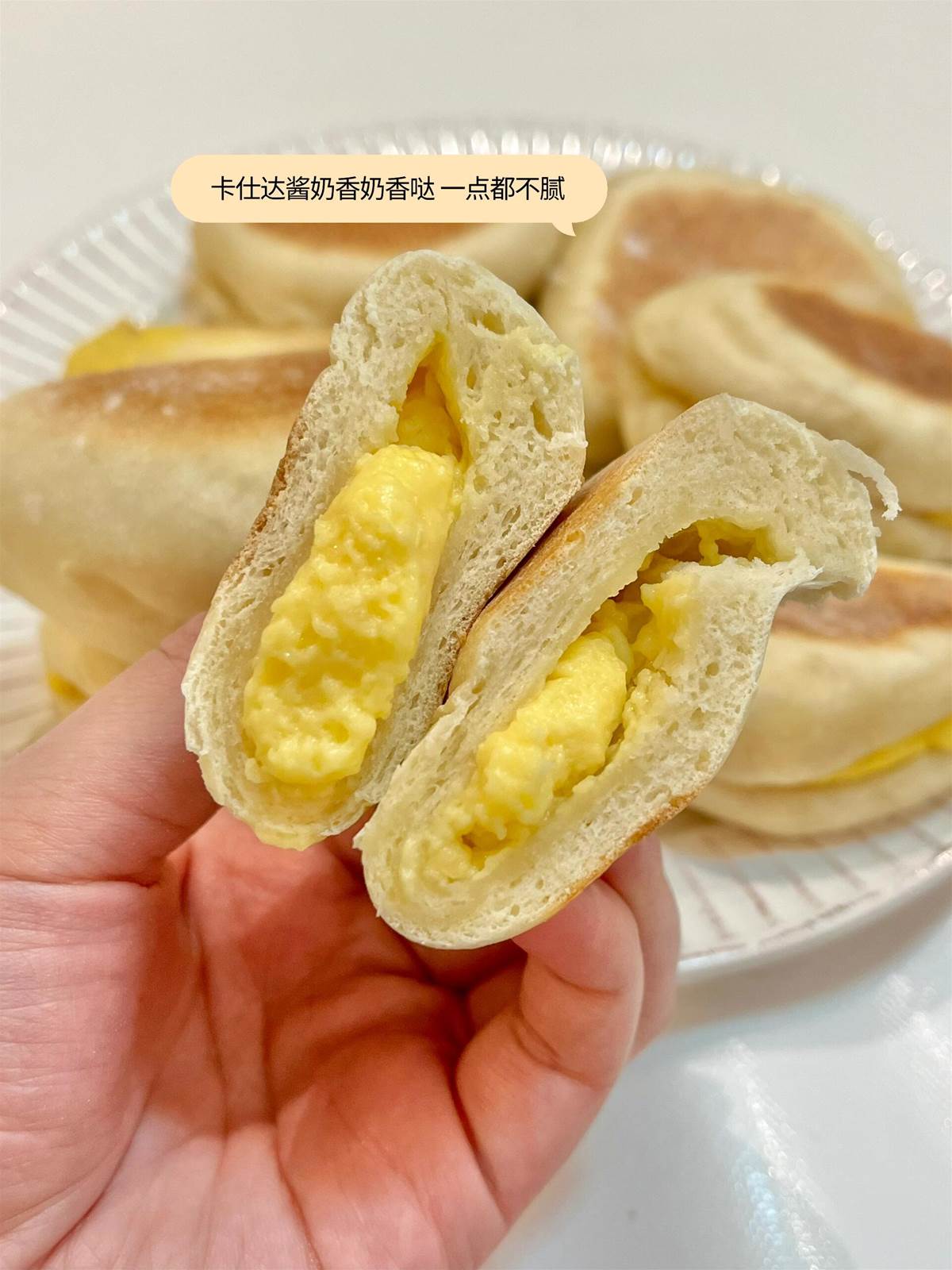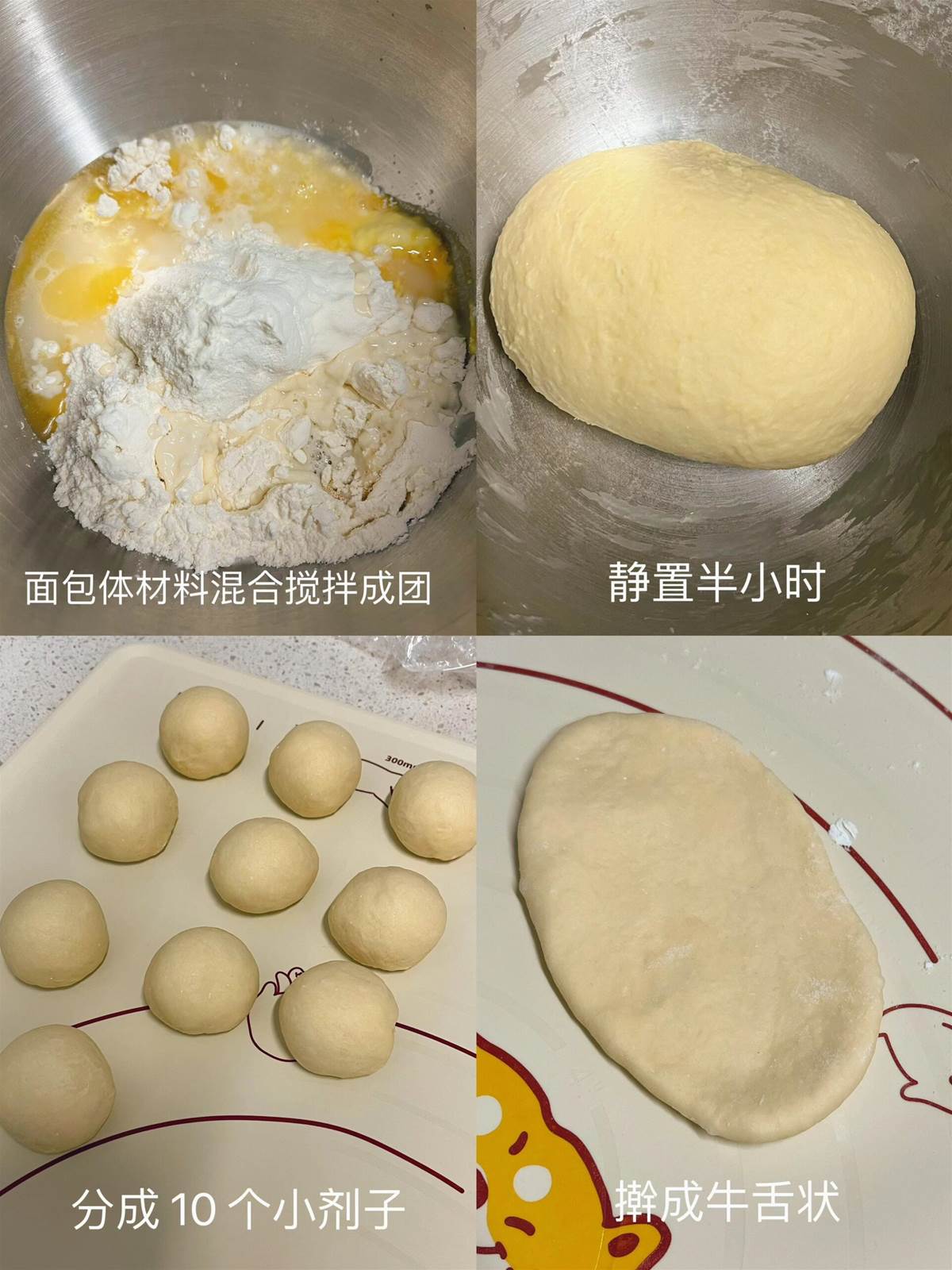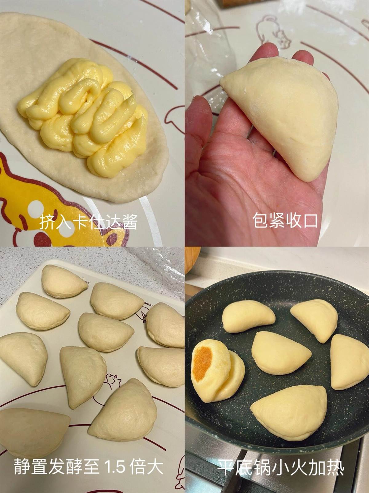 2、麵包材料混合攪拌成團,靜置醒發半小時後,分成10個小劑子。每個小劑子搟成牛舌狀,擠入卡仕達醬,包好捏緊收口。靜置發酵至1.5倍大。
