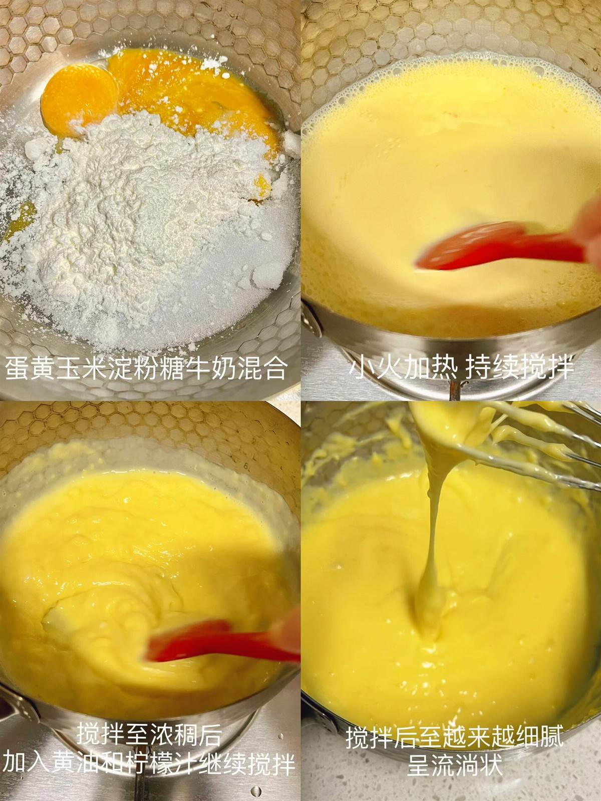 1、【卡仕達醬】除黃油和檸檬汁外,把所有材料混合小火加熱,邊加熱邊攪拌至濃稠狀態後關火,加入黃油和檸檬汁攪拌,最後呈絲滑的流淌狀態就好了。
