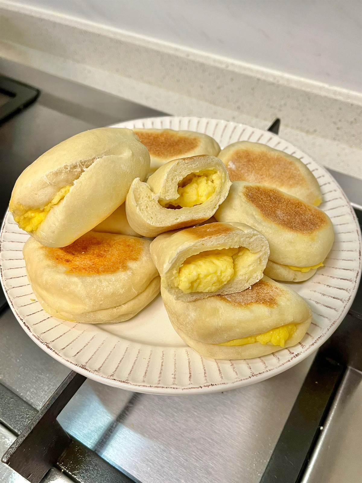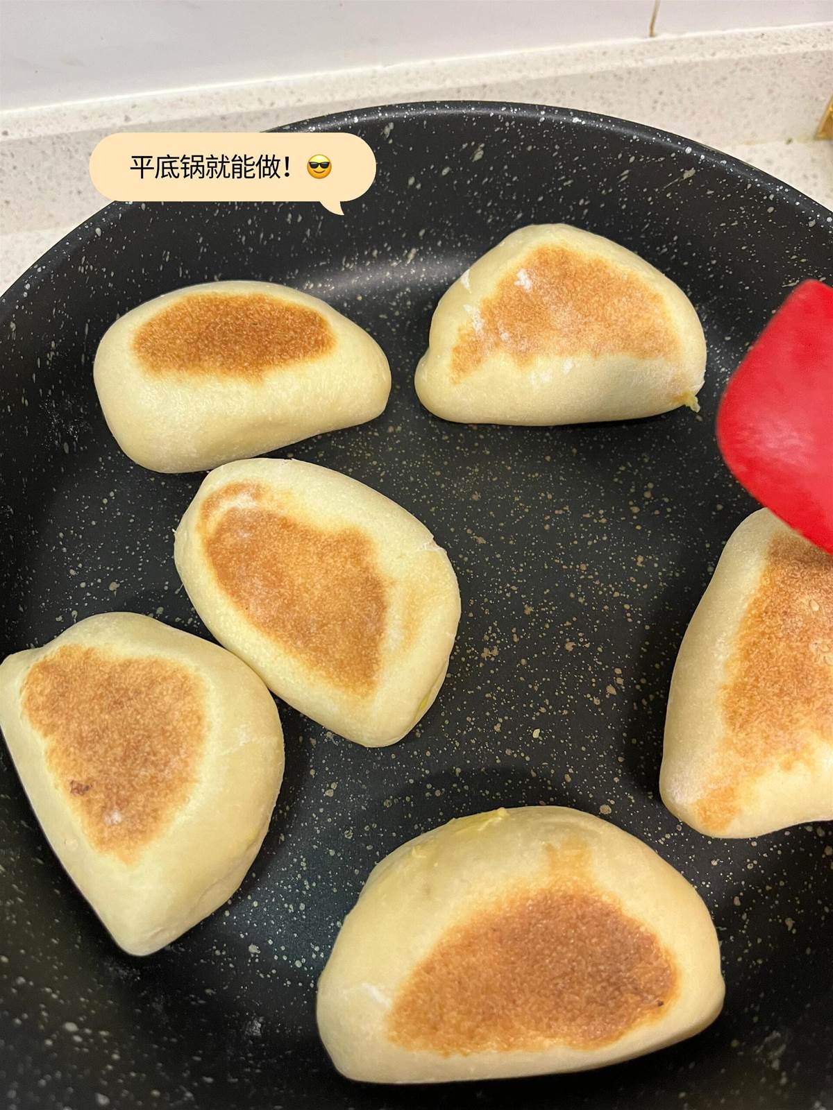 3、平底鍋全程小火加熱,大概 10分鐘左右就好啦,中途記得翻面哦~ 這個麵包有二次發酵的過程 所以即使用平底鍋做出來的也特別鬆軟