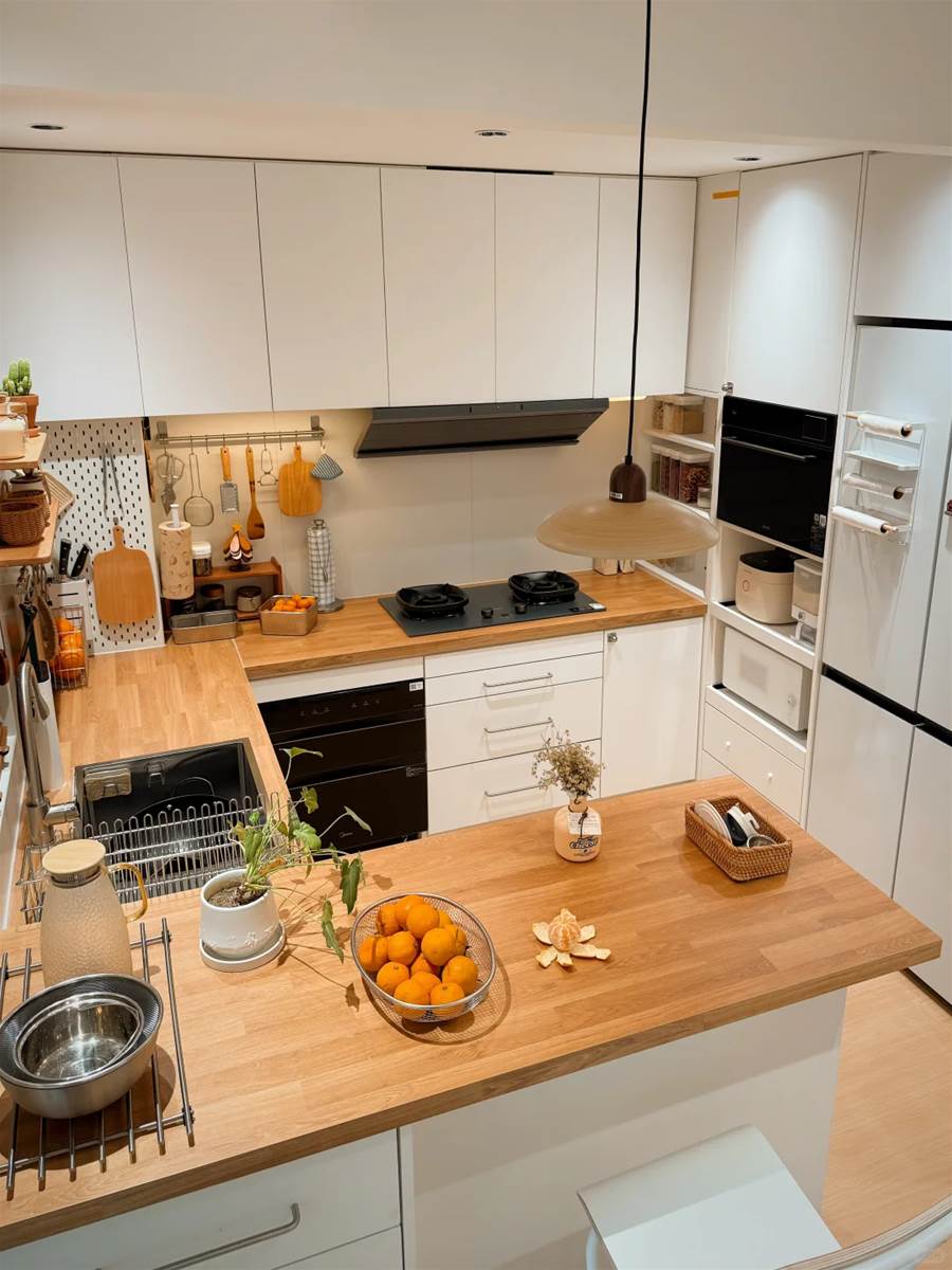 關于收納: 5米地柜+高柜全利用 別看面積小,收納力卻超強 5米地柜|嵌入消毒柜,餐具收納+殺菌一步到位 內部全做抽屜設計,大鍋、湯鍋、炒鍋都能平放 一拉就出,再也不用鉆進柜子翻找! 高柜區|家電嵌入+抽屜收納 冰箱、蒸烤箱全嵌入,推拉門一關,整潔又美觀 上方加了多個抽屜,電飯煲、微波爐、 小家電拖出來就能用,推回去就隱身,太香了! 墻面收納DIY
