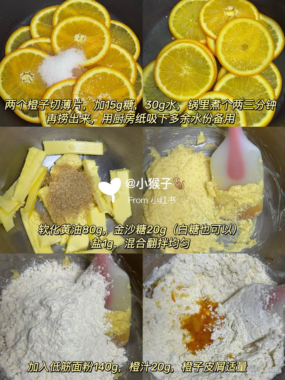 橙子,糖15g,水30g軟化黃油80g,糖20g,鹽1g,低筋麵粉140g,橙汁20g,橙子皮屑適量,融化的黑巧克力