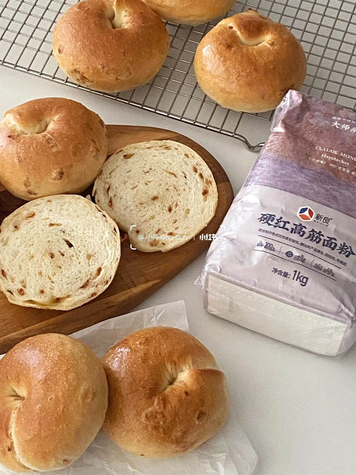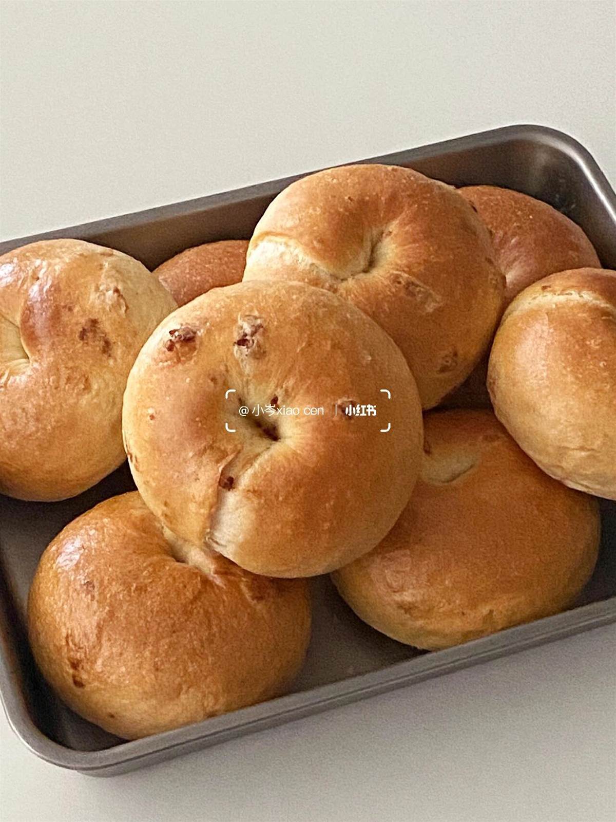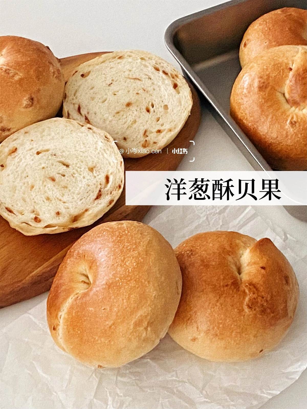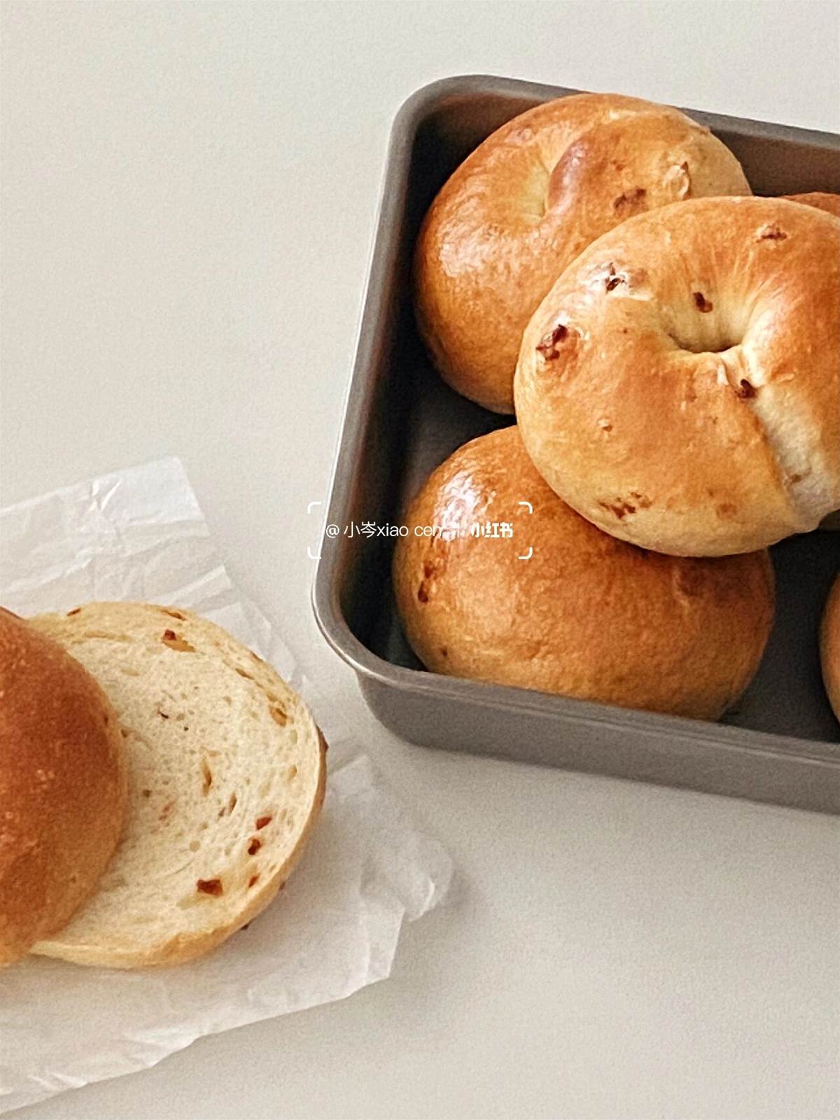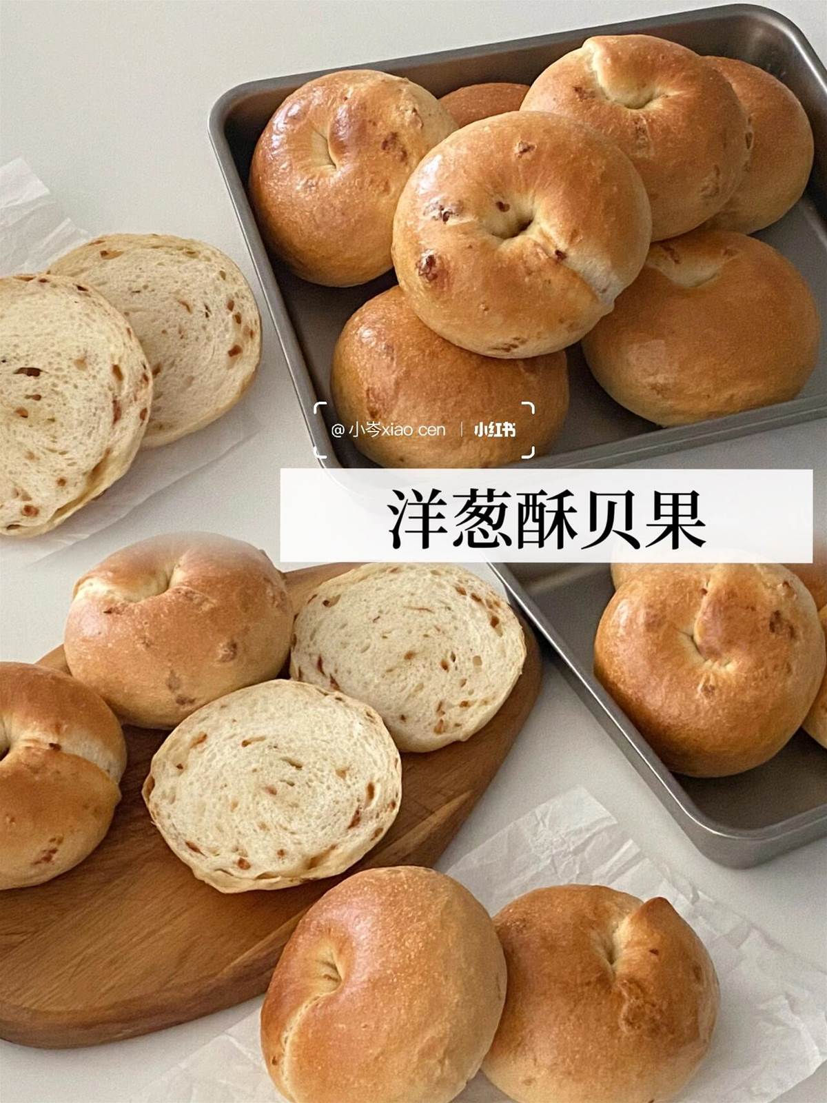 高筋粉400克、奶粉10克、乾酵母4克、鹽4克、水275-285克(看狀態增減)、洋蔥酥20克、水1000克(煮貝果)