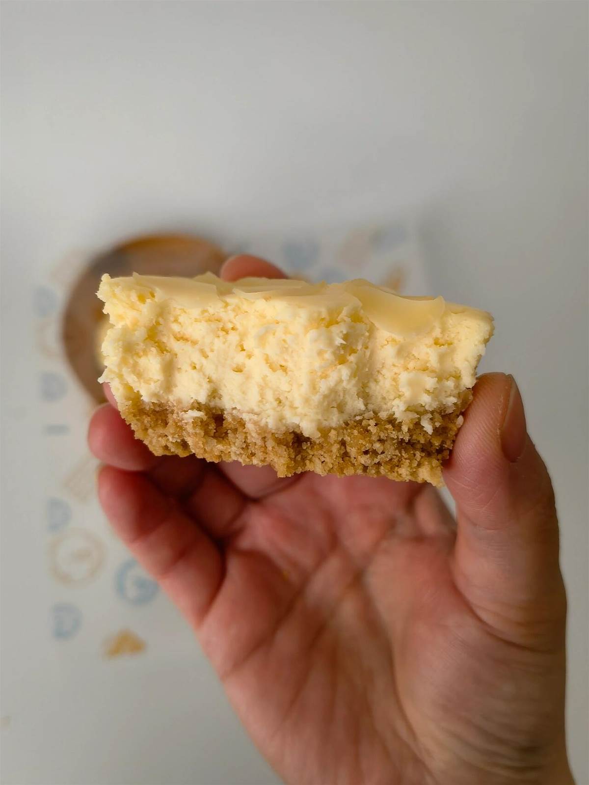 上層的乳酪蛋糕體因為烘烤時間短暫,非常嫩且細膩加上有檸檬汁的加持吃著很清爽,