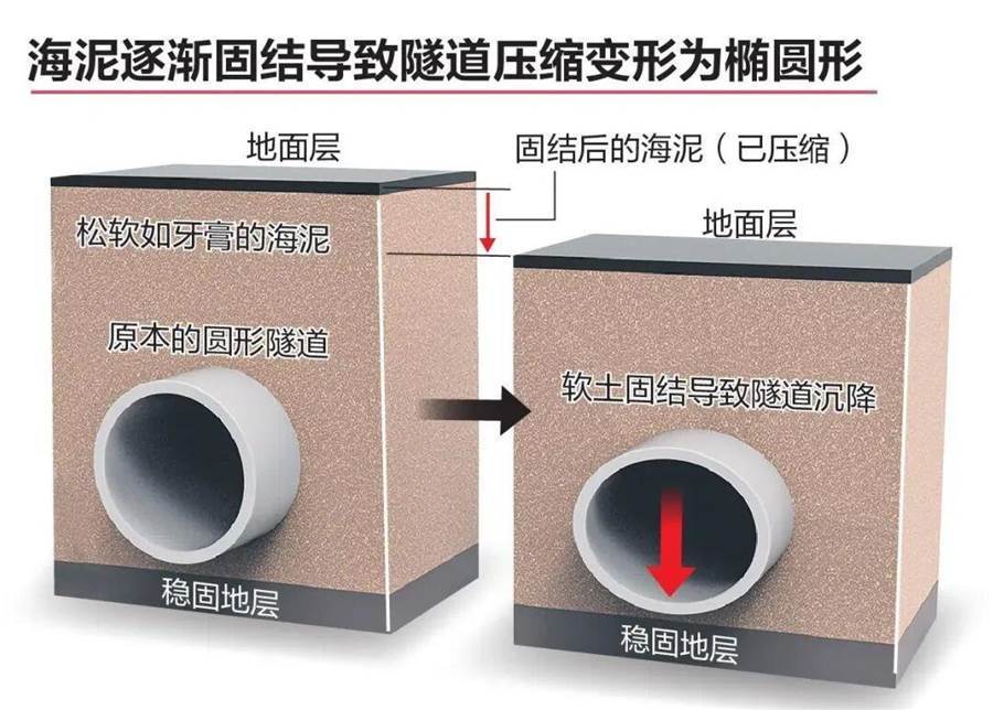 由于海泥层逐渐固结,导致环线三个站之间的两条隧道压缩变形为椭圆形。