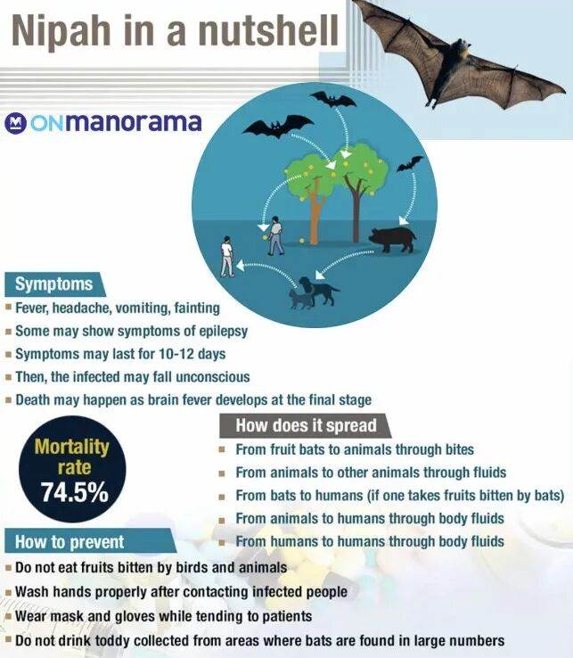 病毒的自然宿主是果蝠,中间宿主通常是猪,也能通过密切接触在人与人之间传播。不同国家统计显示,死亡率约在 40%–75%且目前没有疫苗,也没有特效药。
