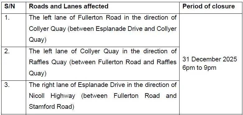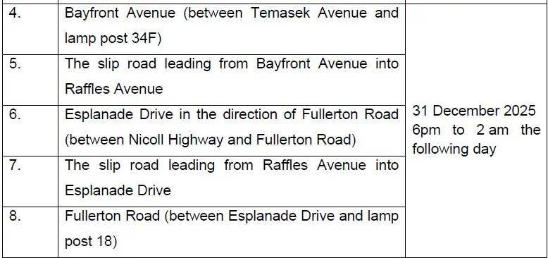 12月31日,新加坡全岛各地也将举办倒数活动,当中包括滨海湾、加冷汇、圣淘沙等。新加坡警方发布文告指出,在跨年倒数活动中,滨海湾和加冷一带预料将迎来大批人潮。因此这34个路段从傍晚6点起将陆续关闭,禁止车辆通行。