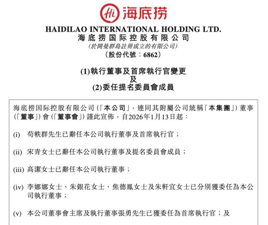 1月13日晚间,海底捞在港交所发布公告称,因公司战略发展需要进行董事会组成及角色调整,苟轶群已辞任公司执行董事及首席执行官;董事会主席兼执行董事张勇获委任为公司首席执行官,自2026 年1月13日起生效。这意味着,在将 CEO一职交出4年之后,张勇选择重新回到一线,亲自接管公司日常经营与战略执行。