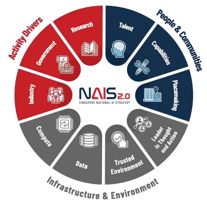 自2023年发布《国家AI战略 2.0》(NAIS 2.0)起,在国家层面,新加坡已明确提出“让AI服务公共利益,为新加坡及全球创造价值”的长期愿景,并将人工智能确立为核心国家竞争力之一。从2017年启动AI Singapore计划算起,至今在“RIE2020”与“RIE2025”两个阶段性科研与创新框架下,相关投入累计已超过10亿新元。