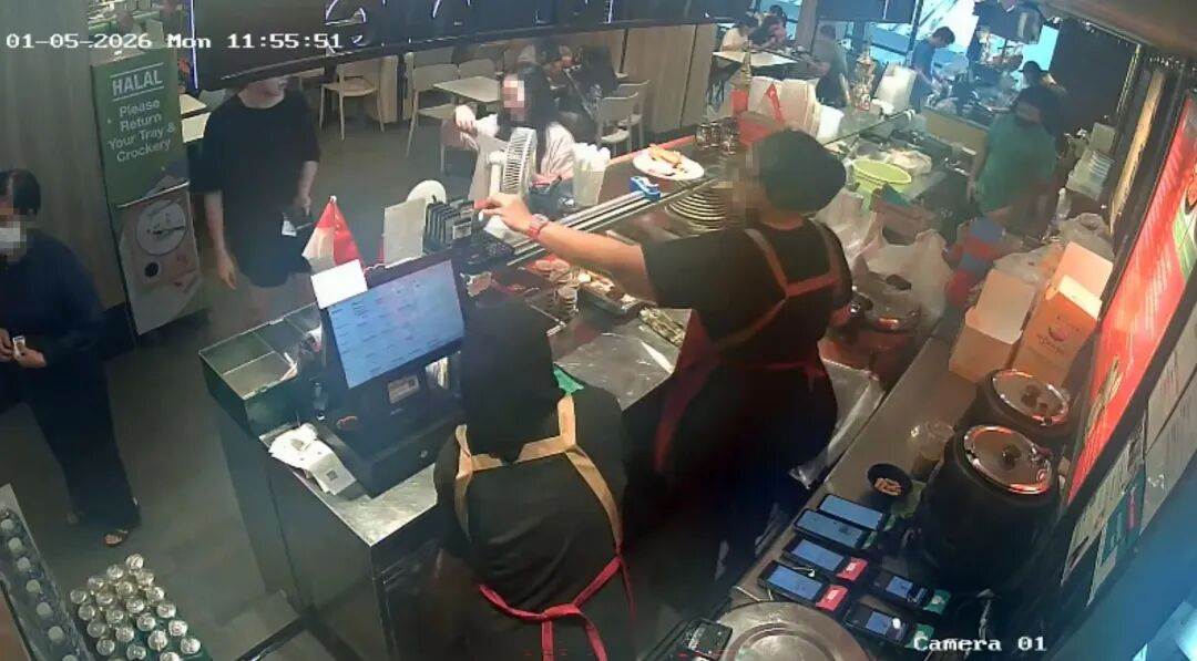 闭路电视画面显示,食客取餐时也查看了收据,但没进一步查询一元“农历新年附加费”。(受访者提供)