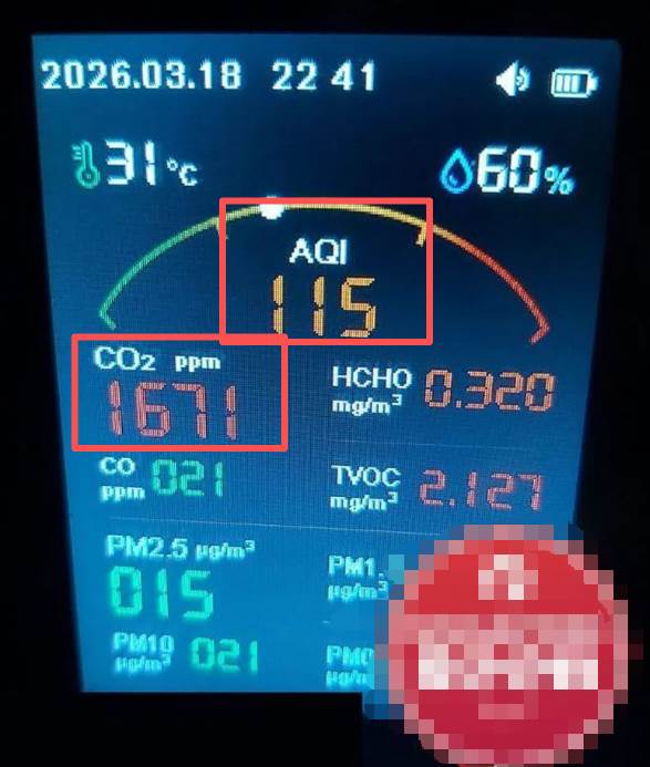 数据显示,家里的空气质量指数(AQI)一度达到115,已经属于对敏感人群不健康的水平;二氧化碳浓度更是飙到1671ppm。此外,TVOC和PM2.5也都偏高。