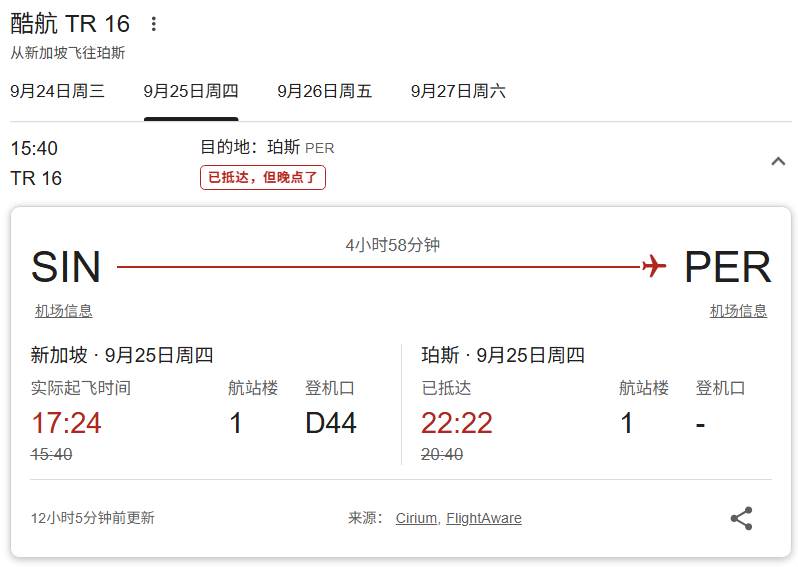 飞机最终比原定时间晚了一个多小时才从新加坡起飞,到达珀斯时,足足晚点了1小时42分钟。
