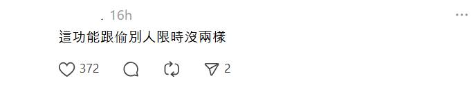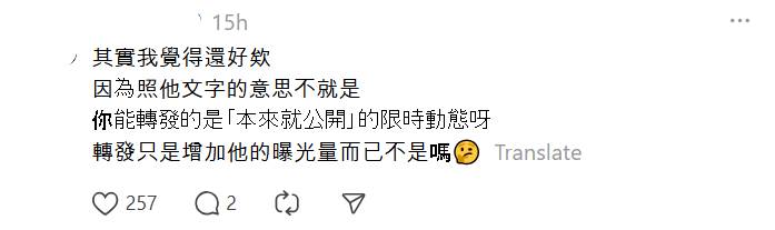 “其实我觉得还好欸,因为你能转发的是本来就公开的限时动态,转发只是增加曝光量而已不是吗?”