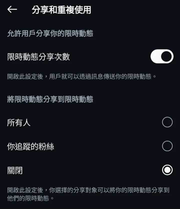 其实,这项功能并不是所有账号都适用,也有人发现只要是私密账号,别人就无法分享限时动态。如果要避免自己的限时动态被转发,可以把账号从公开账号转去私密账号。另外,在维持公开账号的情况下,也可以在设置中把“将限时动态分享到限时动态”的功能关闭。