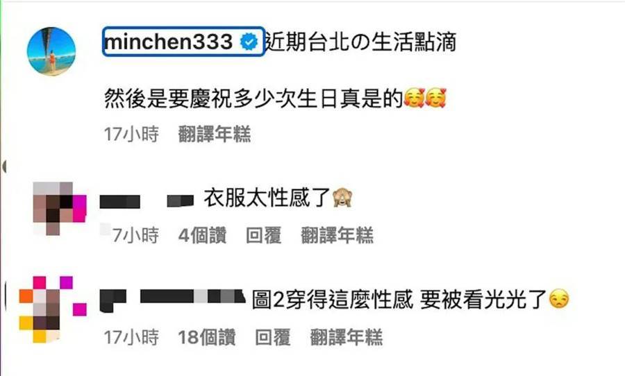 而当中一张庆生相,性感程度更是爆灯,相中林明祯穿上一件透视上衣,透出里面的黑色蕾丝内衣,惊爆火辣上围表露无遗,简直震撼网民眼球,纷纷留言:「衣服太性感了」、「图2穿得这么性感,要被看光光了」、「妳的穿着太诱人了」;也有网民笑指林明祯相中拿着一把刀,加上一身如此性感打扮:「是要想杀死我们吗?」非常搞笑。