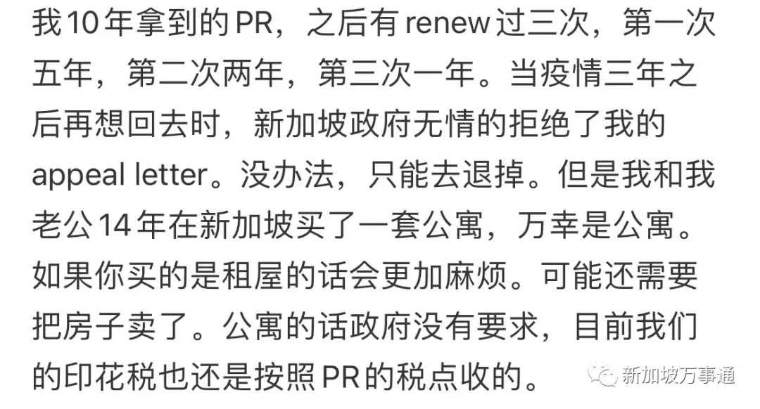 因为之前疫情的原因,一直在中国居住,没有去办理Renew,而且在疫情之前,她也经常离开新加坡。等到疫情结束了想要回新加坡,结果新加坡那边的政府却拒绝了她的申诉信。也因此失去了PR的身份。
