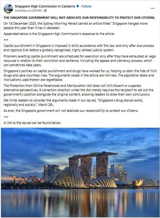 新加坡驻堪培拉最高专员公署星期一(12月22日)在脸书发文,回应《悉尼先驱晨报》(Sydney Morning Herald)上星期四(18日)刊登、题为《新加坡今年死刑处决人数创数十年来新高》的报道。