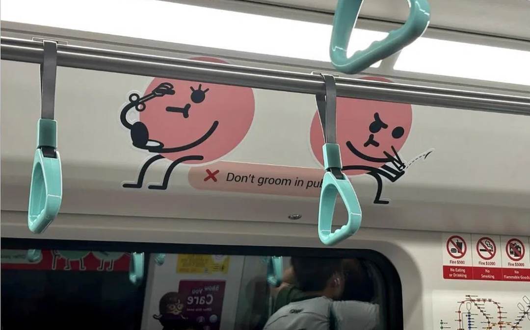 最近,有细心的乘客发现,本地地铁车厢内悄然出现了一个新标志——“勿在公共空间整理仪容”(No grooming in public spaces)。一个简洁的圆形插画,却像一颗石子投入平静的湖面,瞬间在网上激起千层浪。