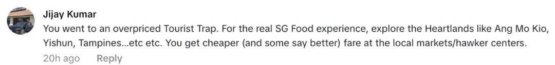 有网友建议,如果他想吃更便宜、更地道的新加坡食物,应该去宏茂桥、义顺、淡滨尼这些居民区的地道小贩中心,价格实惠得多,很多人说味道也更赞。