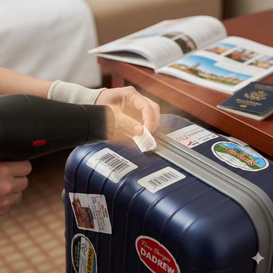 大家可以利用风筒对准条码贴纸,持续吹至表面变热,再尝试用手指抠下来。因为热风可以让贴纸背后的胶水软化,降低其黏性,让它与行李箱分离,达至不残留胶水的效果。如果担心「手残」撕烂贴纸,亦可利用信用卡从边缘位置刮起。