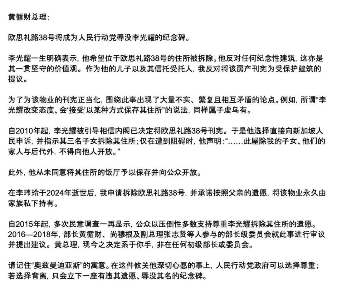 在政府规定的上诉期限截止前,李光耀次子李显扬通过社交媒体发表了致黄循财总理的公开信,重申反对将房屋列为古迹的立场。他强调,父亲李光耀生前多次明确表示希望拆除欧思礼路38号,反对任何形式的纪念性保留,认为这与父亲“不搞个人崇拜”的价值观相悖。