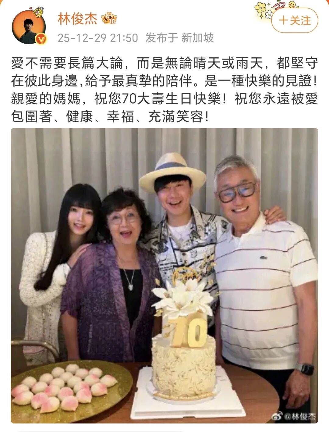 12月29日晚,新加坡华裔实力派歌手林俊杰通过社交平台晒出为母亲庆70大寿的温馨合照,正式官宣恋情,这也是林俊杰女友首度以正牌身份亮相!