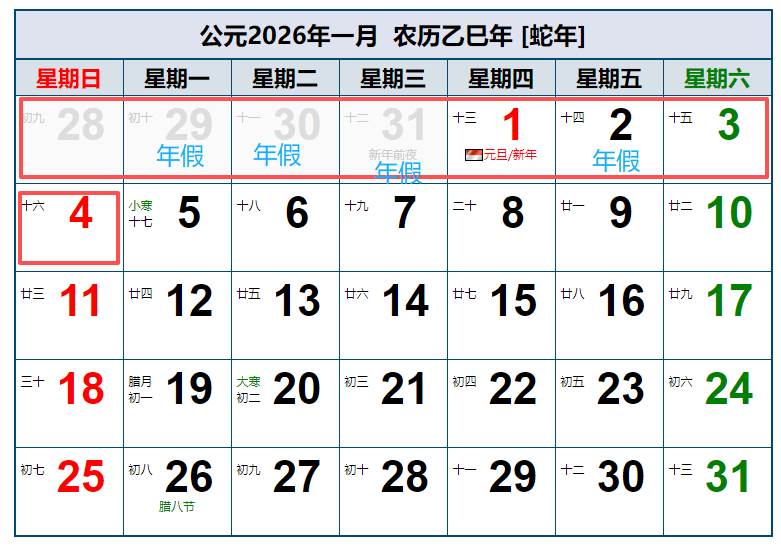 明年元旦落在了星期四,这也就意味着,我们只需要在今年的12月29-31日(星期一到三)、明年的1月2日(星期五)请四天年假,就能享受至少完整的(5天+两个周末4天=9天)的假期了!