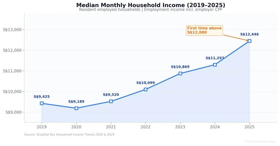 根据最新统计数据,2025年新加坡住户月收入中位数达到了12446新元。首次突破12000新大关。