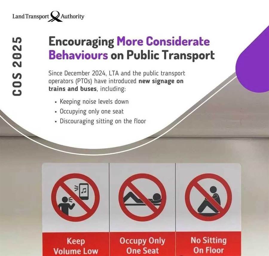 事实上,自去年12月起,地铁和巴士车厢内已陆续张贴提示标识,呼吁乘客避免喧哗、占座、随地而坐等行为。目前虽未明确标注罚款金额,但LTA已加强巡逻与执法力度。