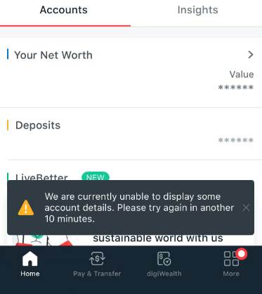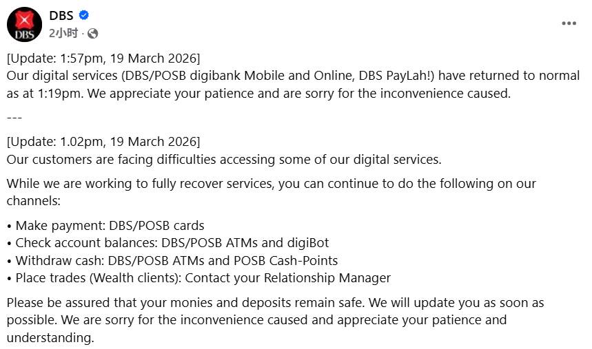 星展银行在社交媒体回应称,客户可继续使用银行卡进行支付,存款保持安全,建议客户通过ATM和digibot服务查询余额。银行正努力全面恢复服务,并对造成的不便致歉。下午2点左右更新,目前已全面恢复。